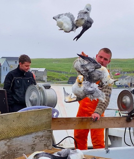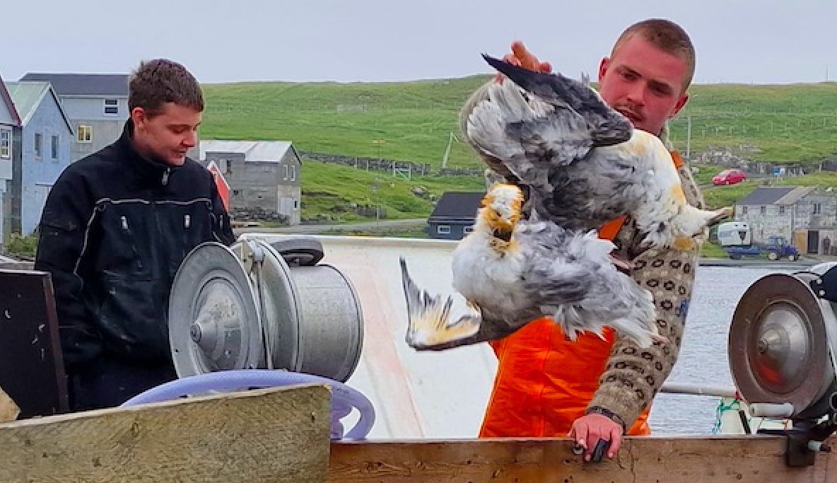 Men, er lotið ov frískligt, tá fuglurin er komin á sjógvin, er skjótt, at ungin lættir sær á aftur og fer á flog. Tá gerst ikki nógv á báti.