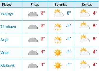 Sunnudagin verður gul til stívt andøvsgul av suðri og landsynningi, 5 til 10 m/s, sum um kvøldið snarar í ein eystan og landnyrðing og verður lot til andøvsgul, 3 til 8 m/s. Skýggjað og okkurt avfall, yvirhøvur sum regn og hitin millum 2 og 7 stig. Um náttina øtlar hann vindin og verður gul til stívt andøvsgul av eystri og landnyrðingi, 5 til 10 m/s. Yvirhøvur skýggjað og regn av og á og hitin millum 2 og 5 stig.