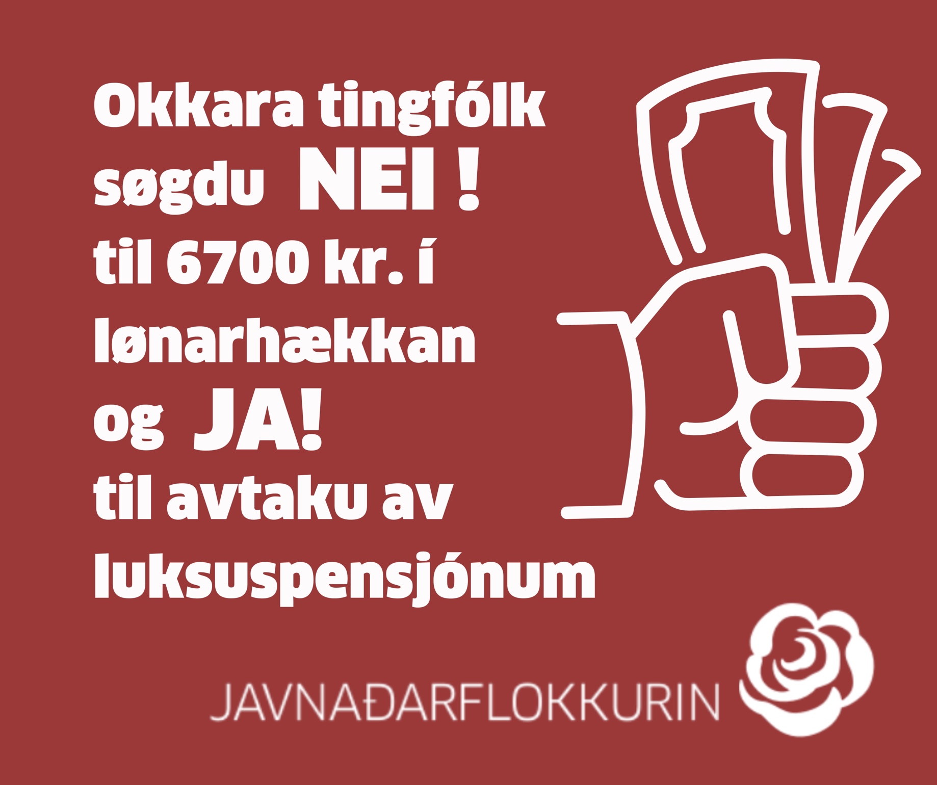 Ein samd tingmanning hjá Javnaðarflokkinum tók IKKI undir við at hækka tingfólkalønirnar 6.700 kr., men tók undir við at BROYTA lukrativu pensjónina hjá tingfólki, so tey framyvir fáa 15 prosent í pensjón, eins og onnur á arbeiðsmarknaðinum.