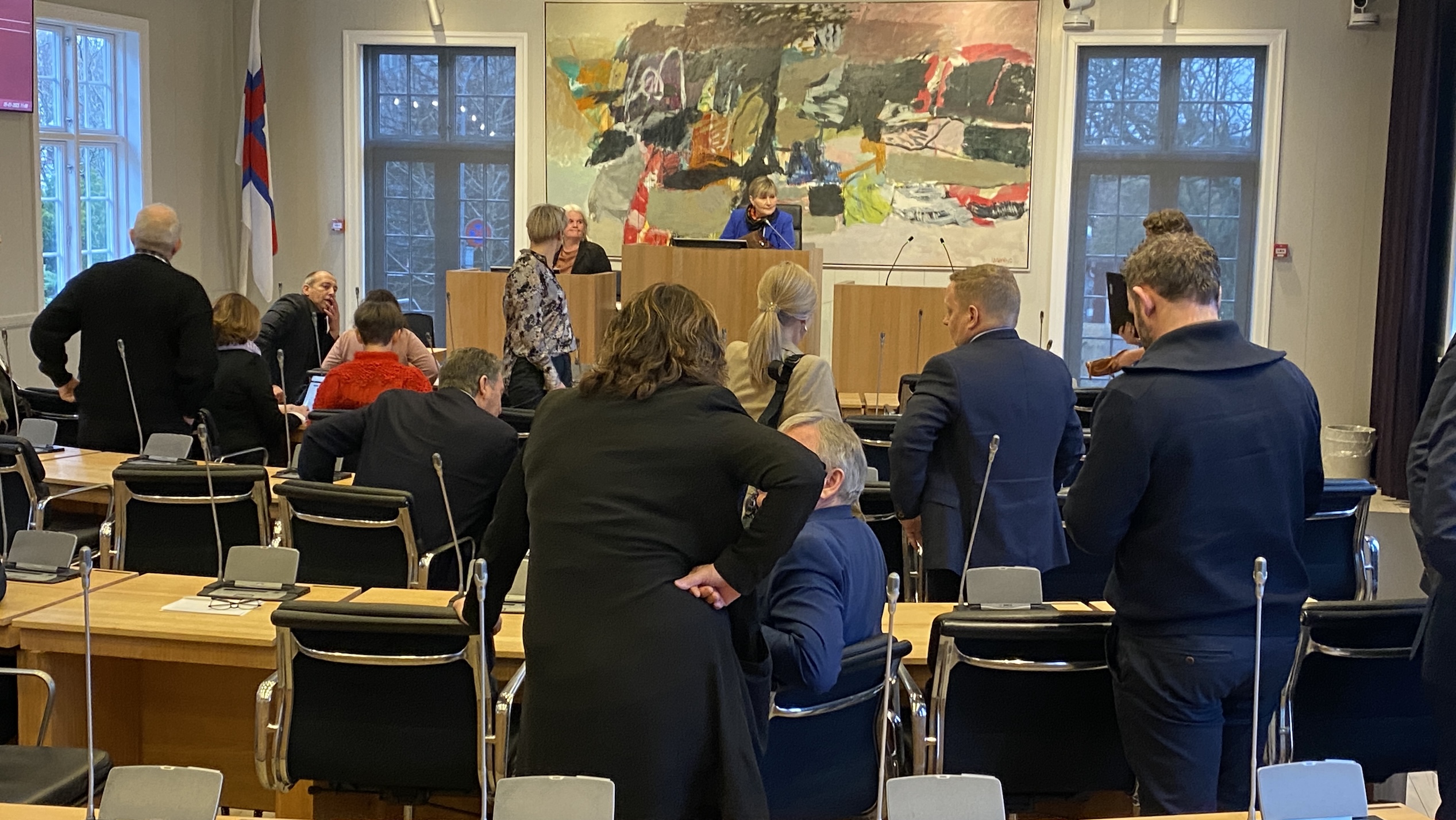 Fyrst var fundur lýstur at vera klokkan 11. Men hann var stutt og skjótt niðurlagdur, meðan flokkarnar skuldu manna nevndirnar. So skuldi fundurin takast upp aftur klokkan 13. Men tá varð hann aftur útsettur til klokkan 14:30 – og nú er hann enn einaferð útsettur til klokkan 16.
