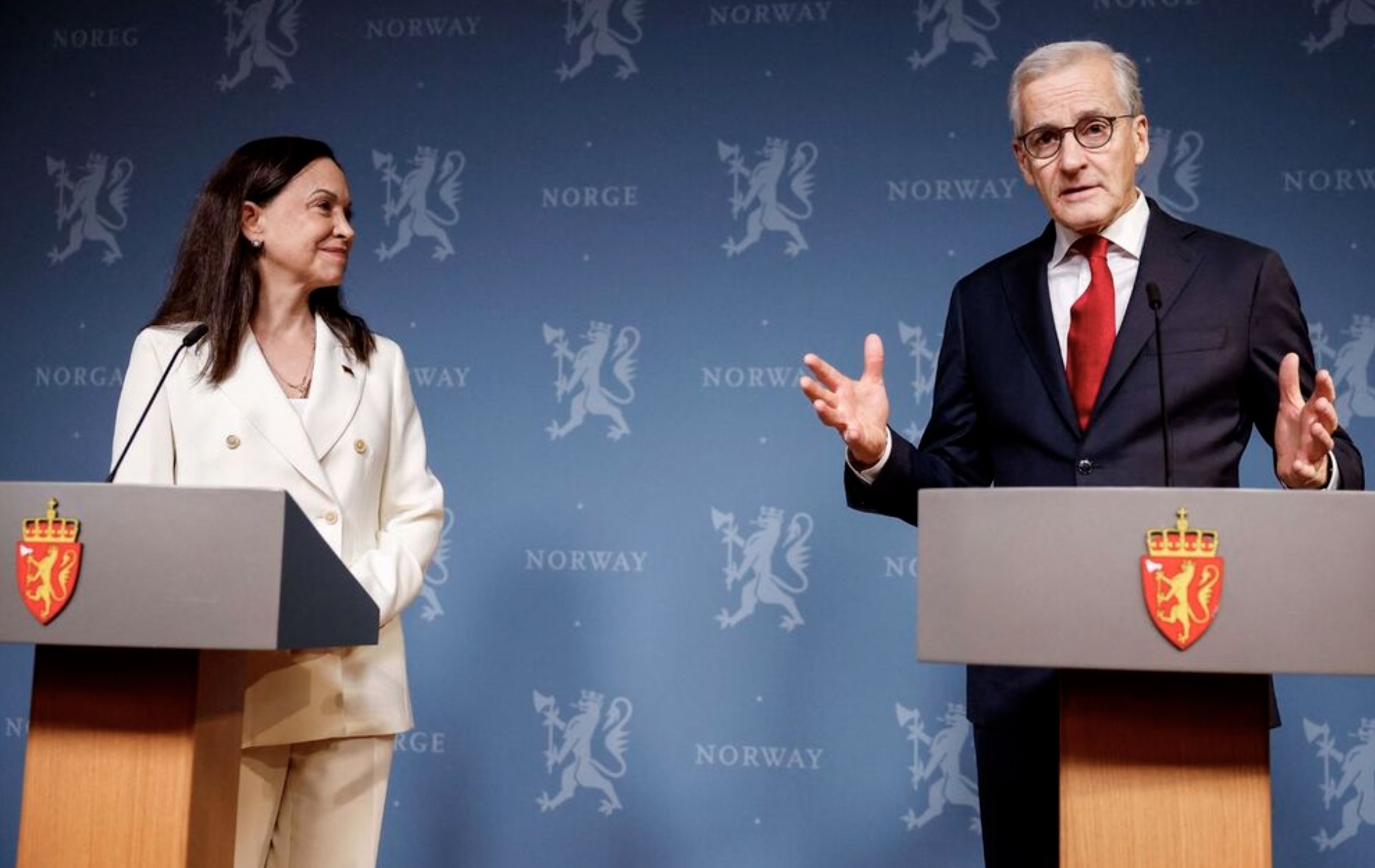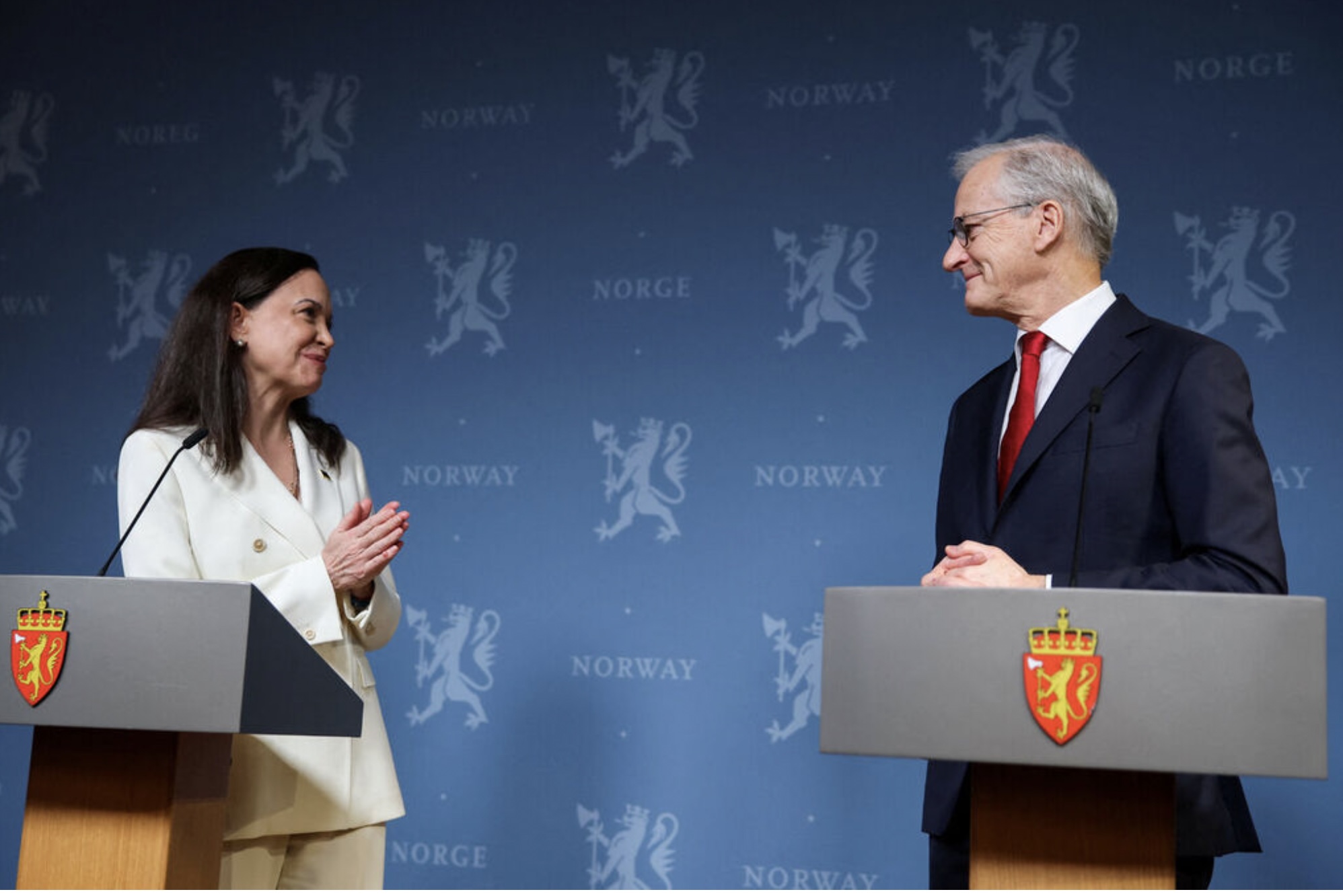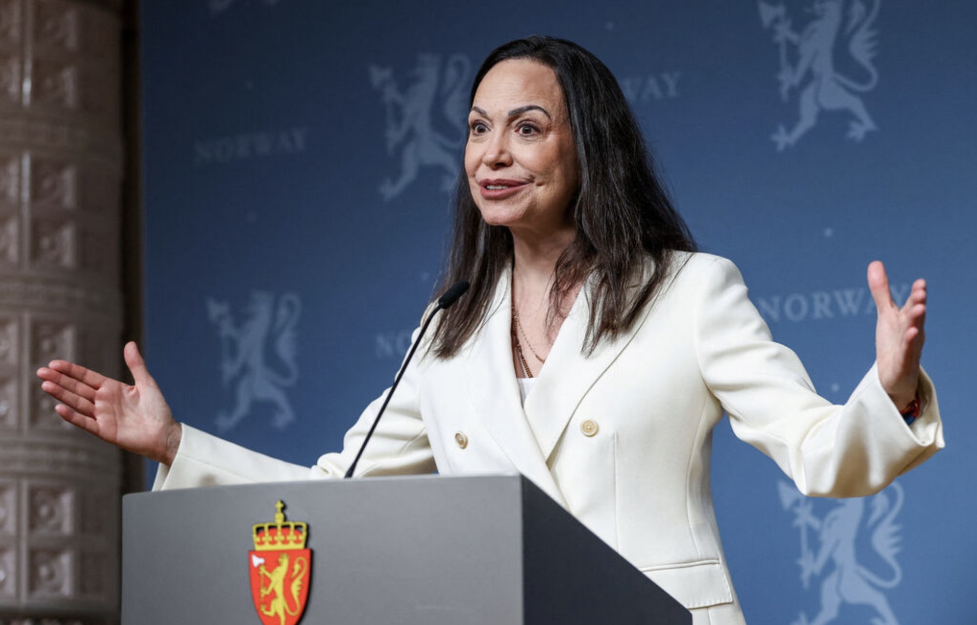 Machado fór ein loyniligan túr til Noregs og kom í gjárkvøldið fram í Oslo hóast ferðabann og hóttan frá venezuelansku stjórnini um, at hon fór at verða mett sum flóttafólk, um hon ferðaðist til norska høvuðsstaðin.