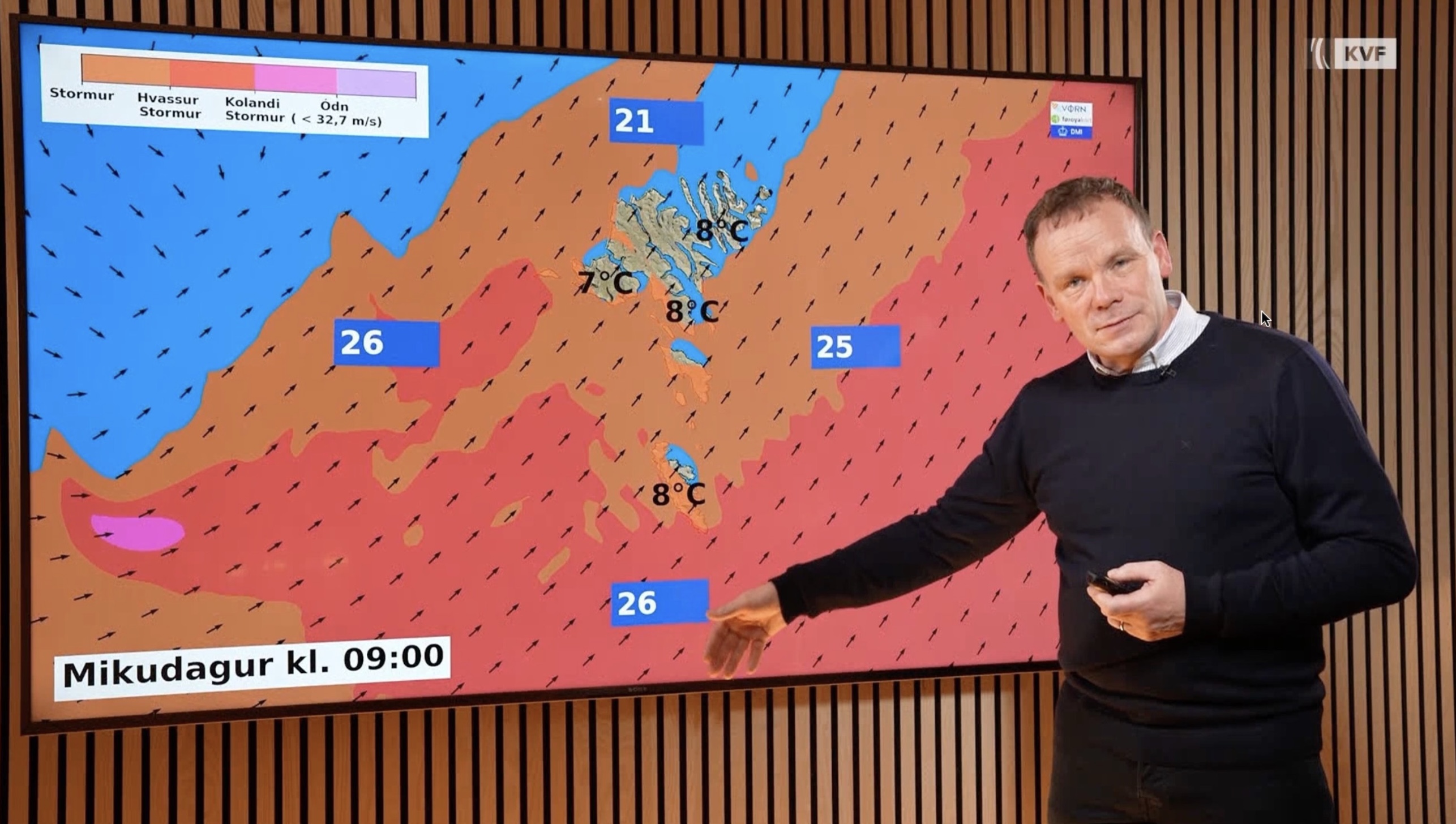Veðurstovan skrivar, at í nátt veksur vindurin upp í skrið ella storm av útsynningi, 18 til 23 m/s. Fyrrapartin í morgin veksandi upp í hvassan storm, 25 til 28 m/s, mesti vindurin er í sunnara parti av landinum.