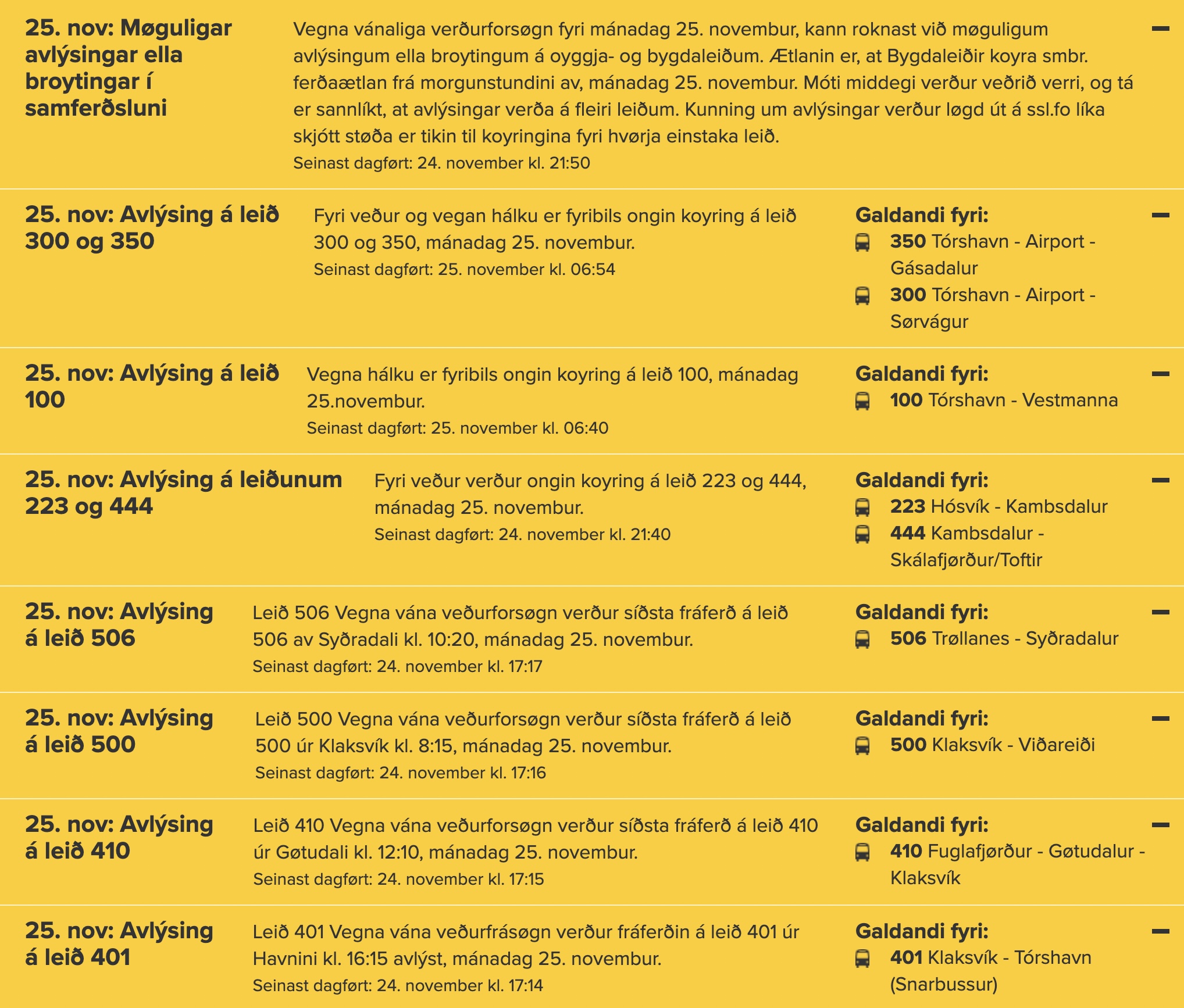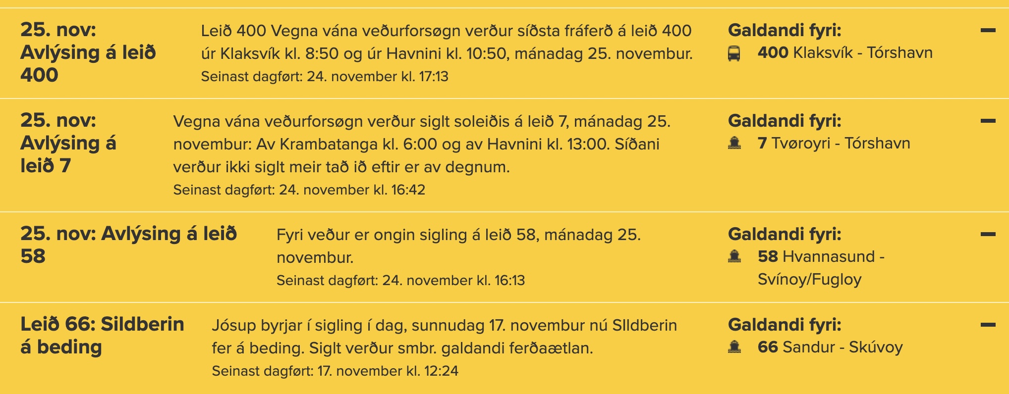 Kunning um avlýsingar verður løgd út á ssl.fo líka skjótt støða er tikin til koyringina fyri hvørja einstaka leið, siga tey á Strandferðsluni.