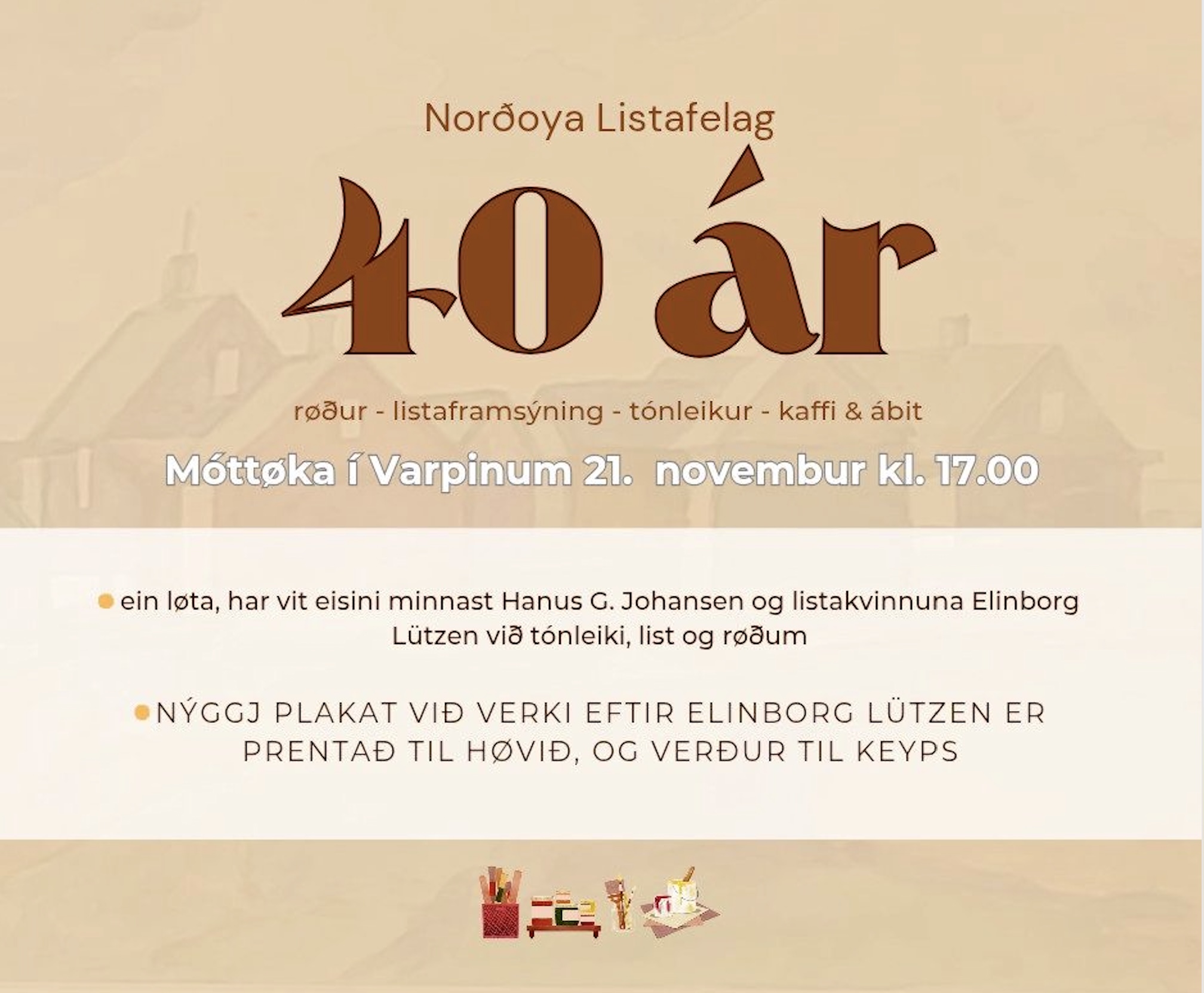 Í ár so 40 ár liðin, síðani Norðoya Listafelag varð stovnað, og verður í hesum sambandi skipað fyri móttøku og framsýning í Varpinum 21. november kl. 17.00, har øll eru vælkomin.