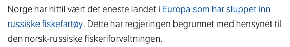 Í grein á heimasíðuni hjá NRK verður sagt, at Noreg er einasta land í Evropa, sum loyvir russiskum fiskiskipum í sínar havnir. Men, í Føroyum vita vit, at hetta er ikki rætt, tí her hava verið mong russisk fiskiskip, síðan Russland leyp á Ukraina hin 24. februar í ár.