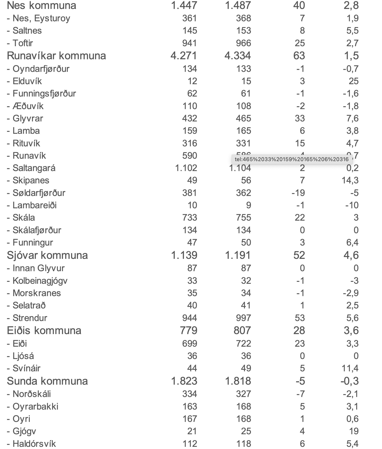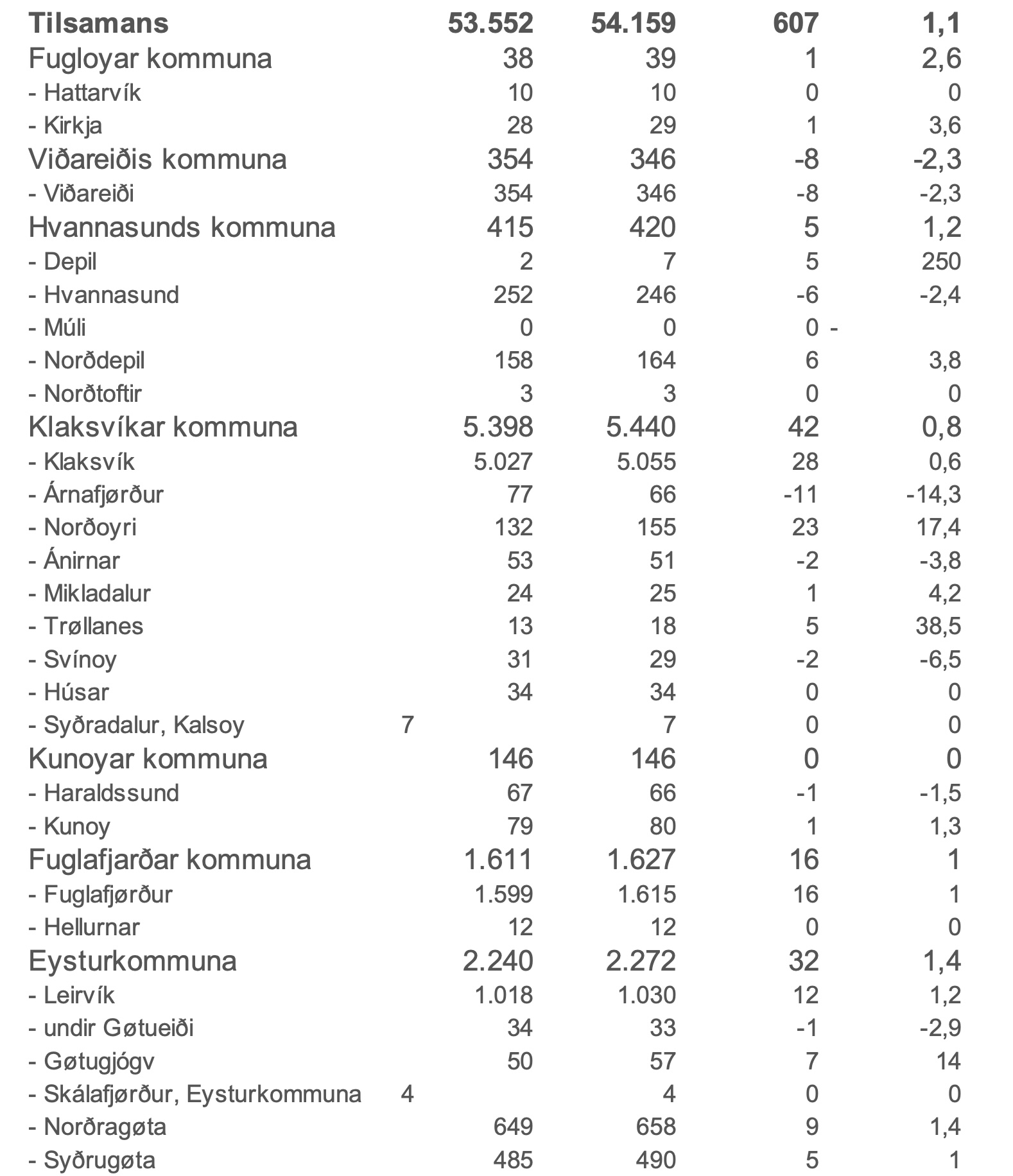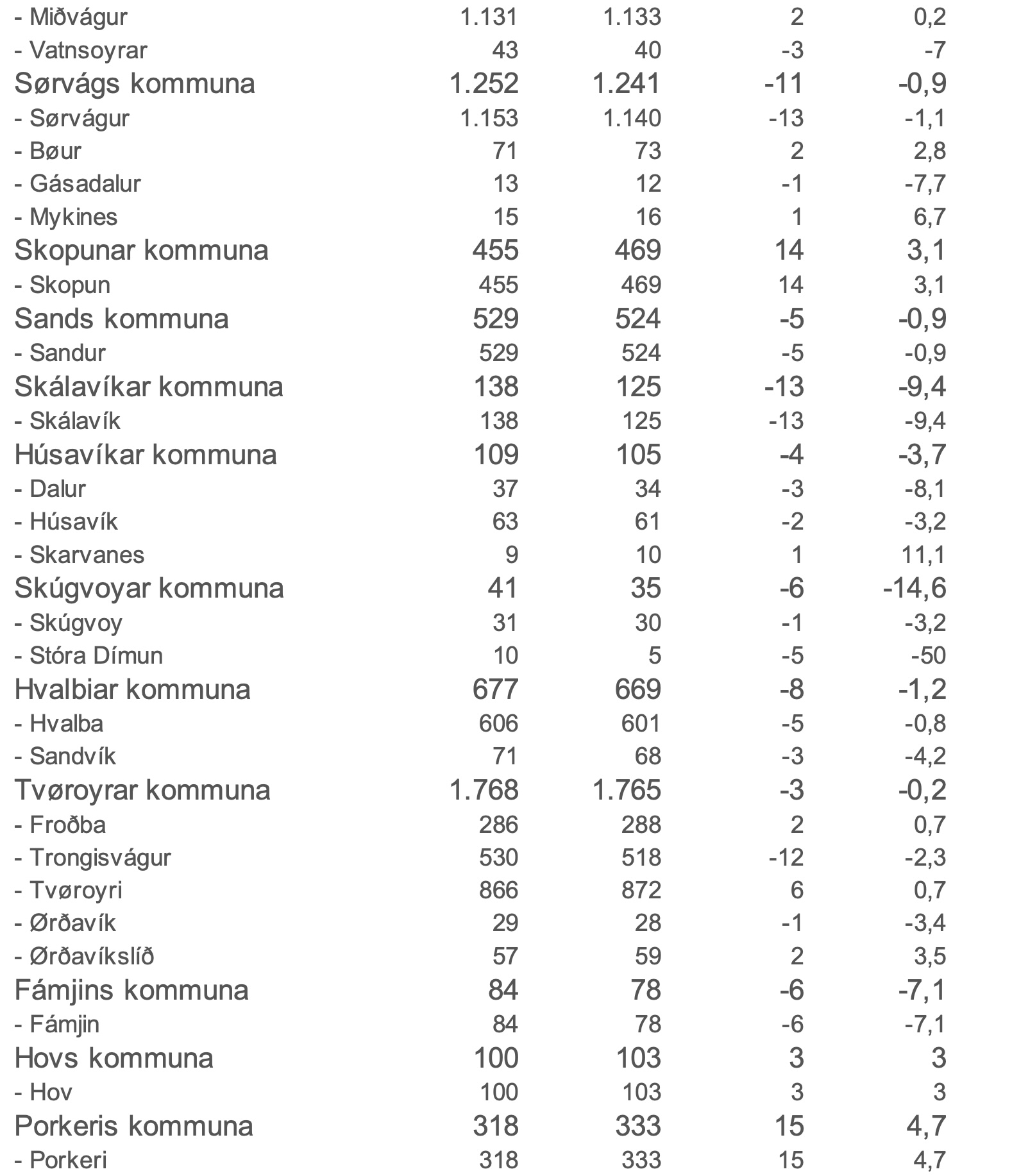 Runavíkar kommuna | 4.271 | 4.334 | 63 | 1,5 |