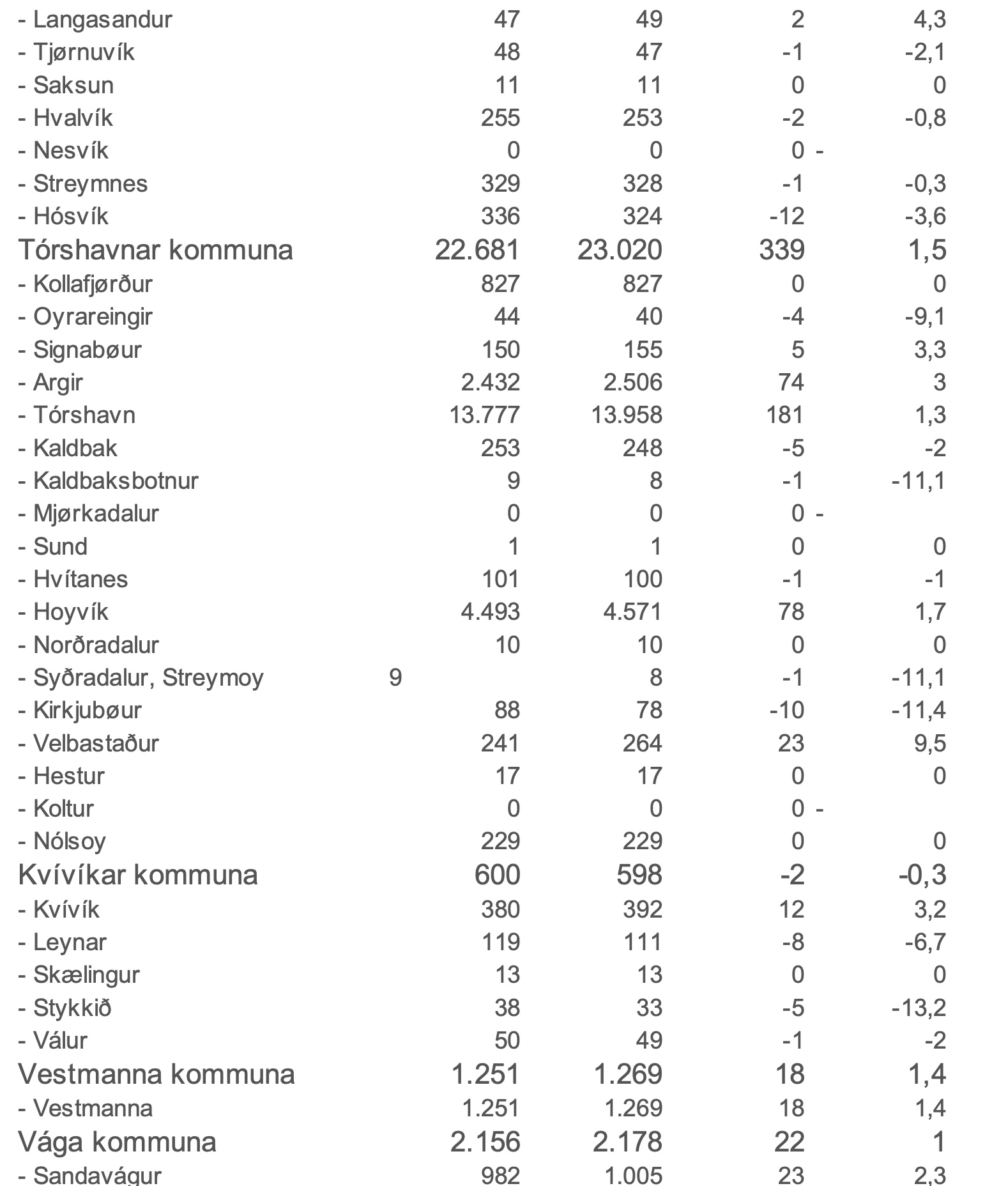 Tórshavnar kommuna | 22.681 | 23.020 | 339 | 1,5 |