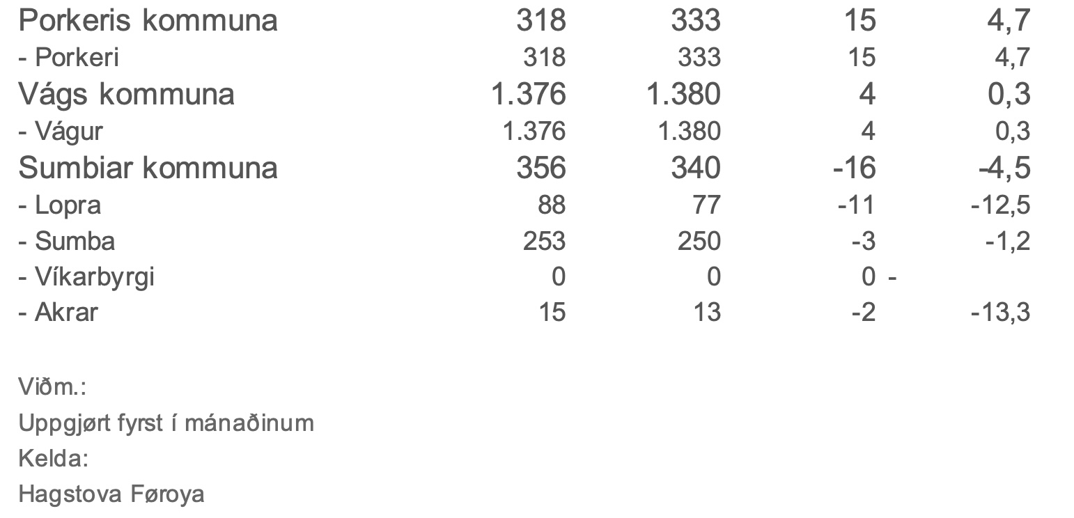 Vágs kommuna | 1.376 | 1.380 | 4 | 0,3 |