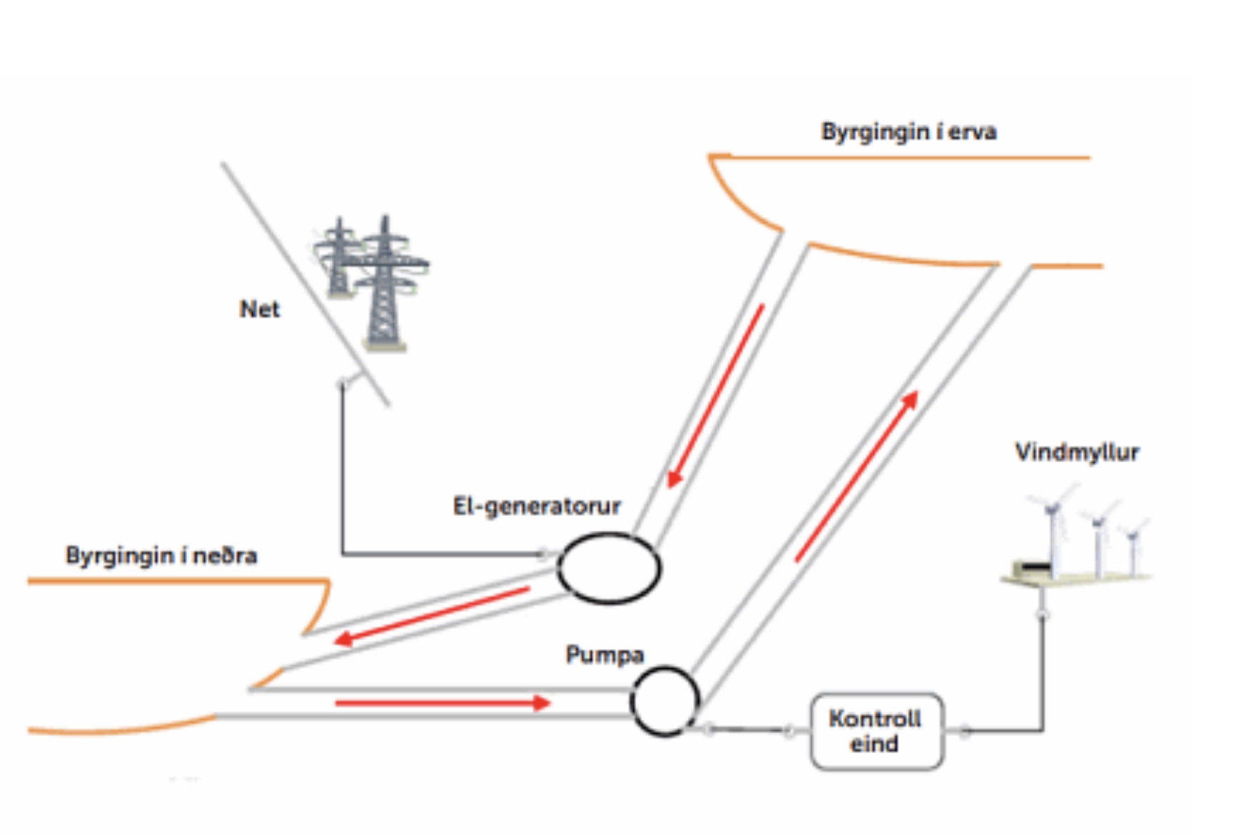 Tað merkir, at vatnið, sum rennur úr byrgingini á Mýrunum, rennur oman ígjøgnum eitt vatnorkuverk og ger streym, og síðani rennur tað so í byrgingina í Heygadali. Men tað snilda er, at tá ið tað er yvirskot av streymi frá vindmyllum, verður tann streymurin so brúktur til at pumpa vatnið niðan aftur í byrgingina, so at tað kann brúkast fleiri ferðir.