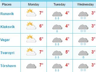 Týsdagin verður lítið lot av ymsum ættum, undir 5 m/s. Yvirhøvur skýggjað og stundum regn. Hitin um dagin um 5 hitastig. Út ná náttina verður andøvsgul upp í ein strúk av norðri, 8 til 13 m/s og ælaveður, partvís vátaslettingur ella heglingur. Hitin millum frostmarkið og 3 hitastig.