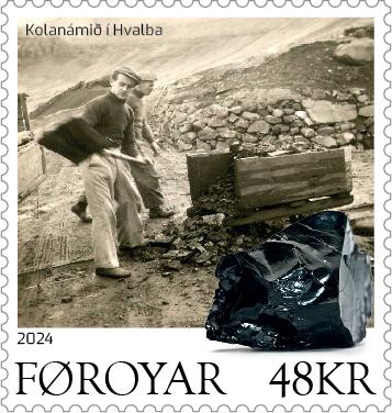 Suðuroyggin er tann einasta oyggin, sum hevur kol í so stórum nøgdum, at har hevur verið virkin kolavinna. Í dag er kolið í Suðuroy meira mentan enn vinna, men slóðir eftir kolavinnuni eru nógvastaðni, og ein virkin kolamina er enn í Hvalba, tó at virksemið er sera lítið. Frímerkið myndar brøðurnar, Erhardt og Simon Næs, sum arbeiða uttanfyri kolanámið.