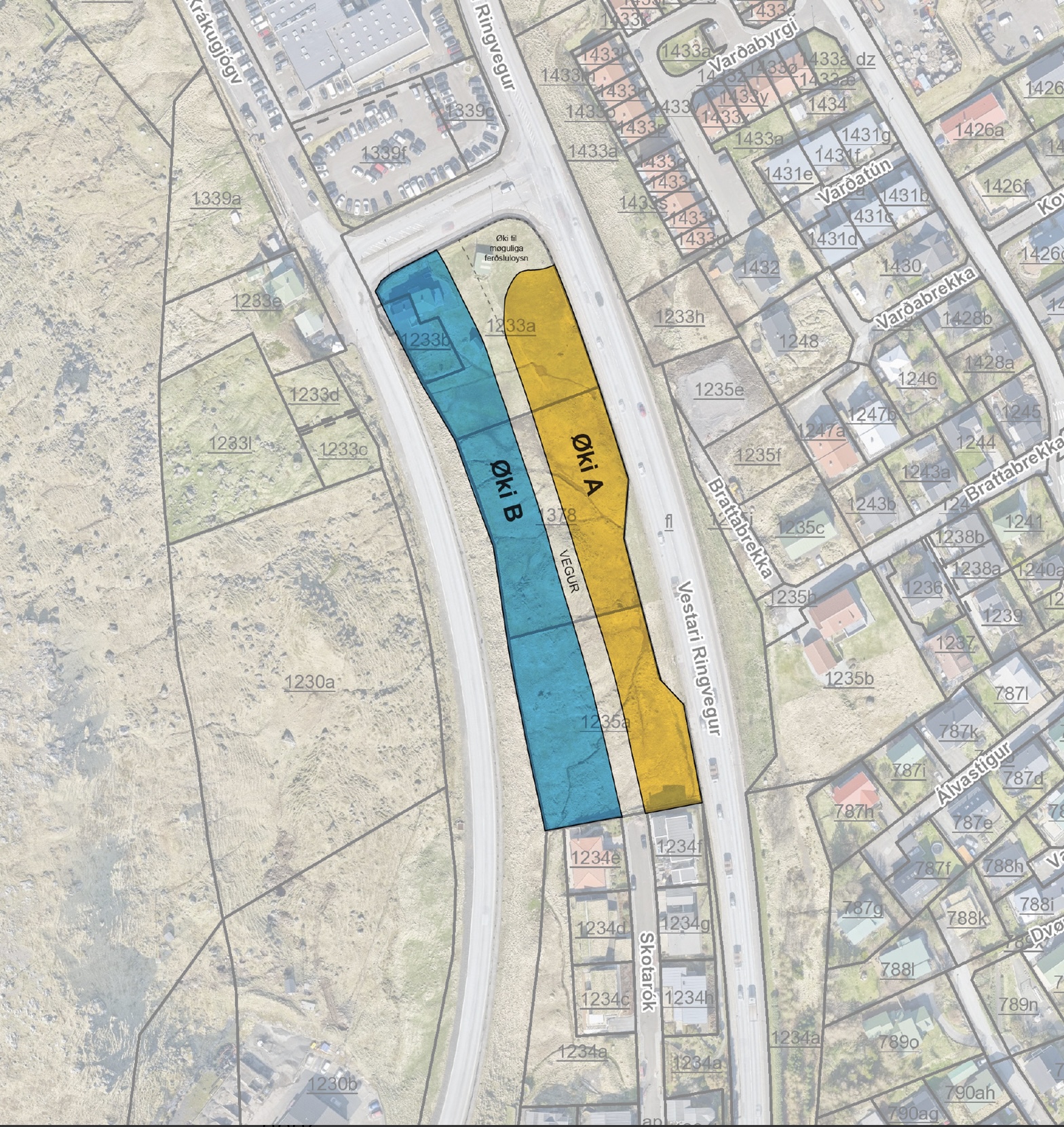 Á býráðsfundi hósdagin í síðstu viku varð samtykt at skipa økið millum Ringvegin og Oyggjarvegi í Havn, sum sæst á myndini omanfyri, til bústaðarbygging. Serstøk byggisamtykt er gjørd, sum skipar hesi viðurskiftini.