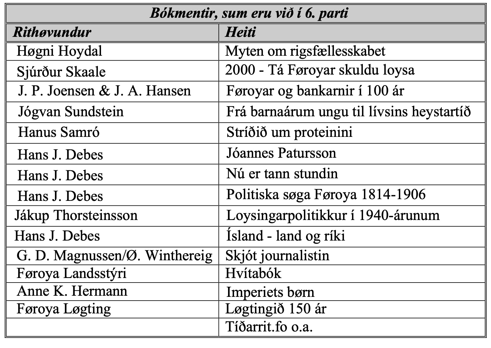Eisini listin yvir bókmentir avdúkar, at næstan bara nationalistiskar bókmentir liggja til grund fyri sendingini: