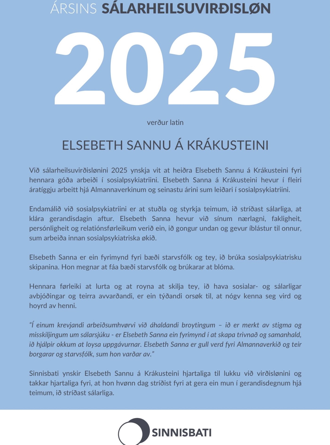 – Vit heiðra somuleiðis Elsebeth Sannu, sum í fleiri áratíggju hevur arbeitt hjá Almannaverkinum og seinastu árini sum leiðari í sosialpsykiatriini. Elsebeth Sanna hevur við sínum nærlagni, fakligheit, persónligheit og relatiónsførleikum verið ein, ið gongur undan innan sosialpsykiatriska økið. Elsebeth Sanna er ein fyrimynd fyri bæði starvsfólk og tey, ið brúka sosialpsykiatrisku skipanina. Hon megnar at fáa bæði starvsfólk og brúkarar at blóma.