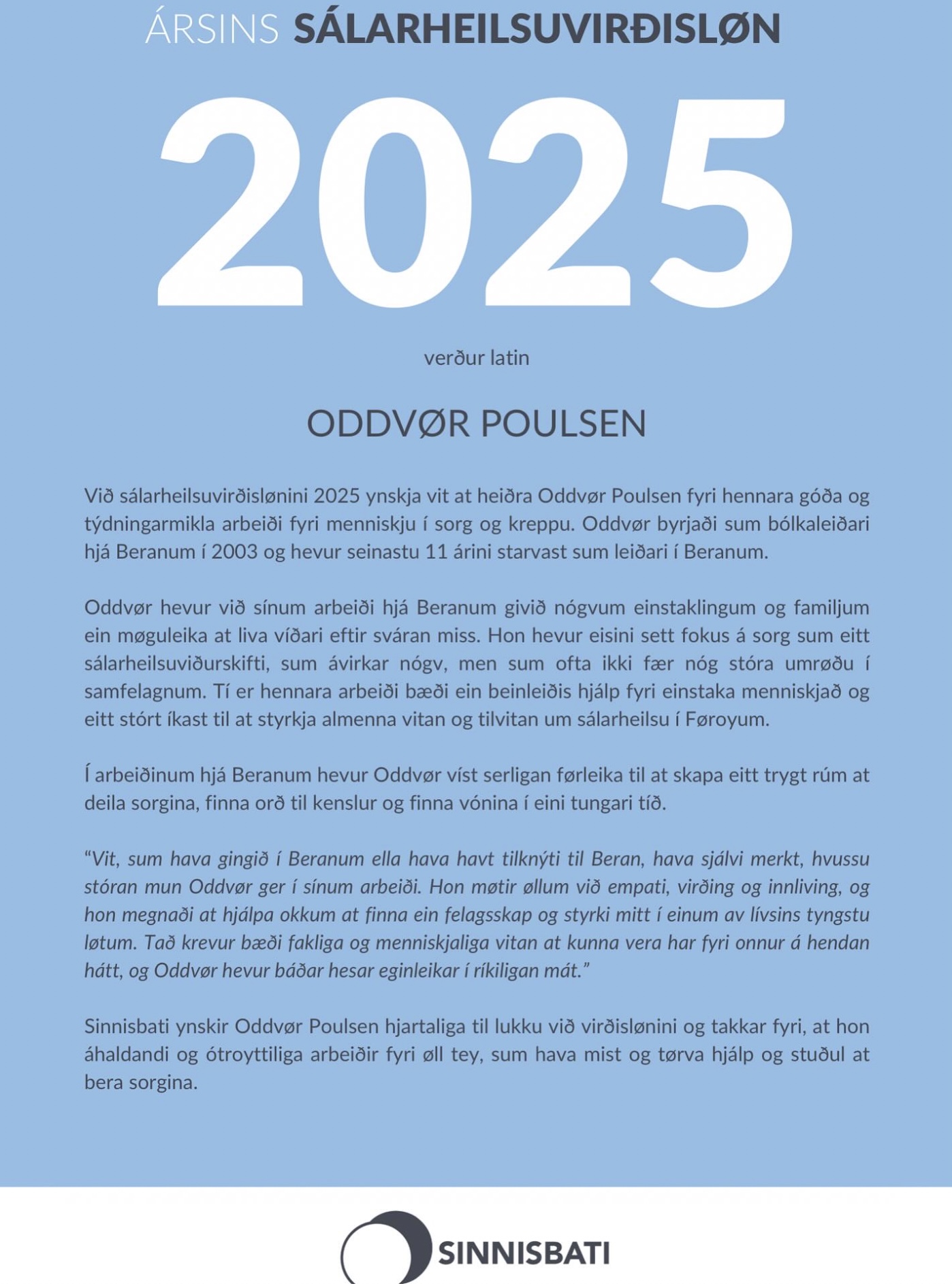 – Vit heiðra Oddvør fyri hennara góða og týdningarmikla arbeiði í Beranum fyri menniskju í sorg og kreppu. Oddvør hevur givið nógvum einstaklingum og familjum ein møguleika at liva víðari eftir sváran miss. Hon hevur víst serligan førleika til at skapa eitt trygt rúm at deila sorgina og finna vónina í eini tungarið tíð. Oddvør hevur eisini sett fokus á sorg sum eitt sálarheilsuviðurskifti, sum ávirkar nógv, men sum ofta ikki fær nóg stóra umrøðu í samfelagnum, skrivar Sinnisbati.