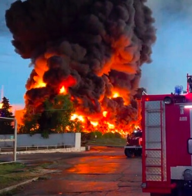 - Fyribils upplýsingar siga, at tað er eitt ukrainskt dronuálop, sum er orsøkin til eldin. Ongar fráboðanir eru um deyð ella løstað, skrivar hann á Telegram.