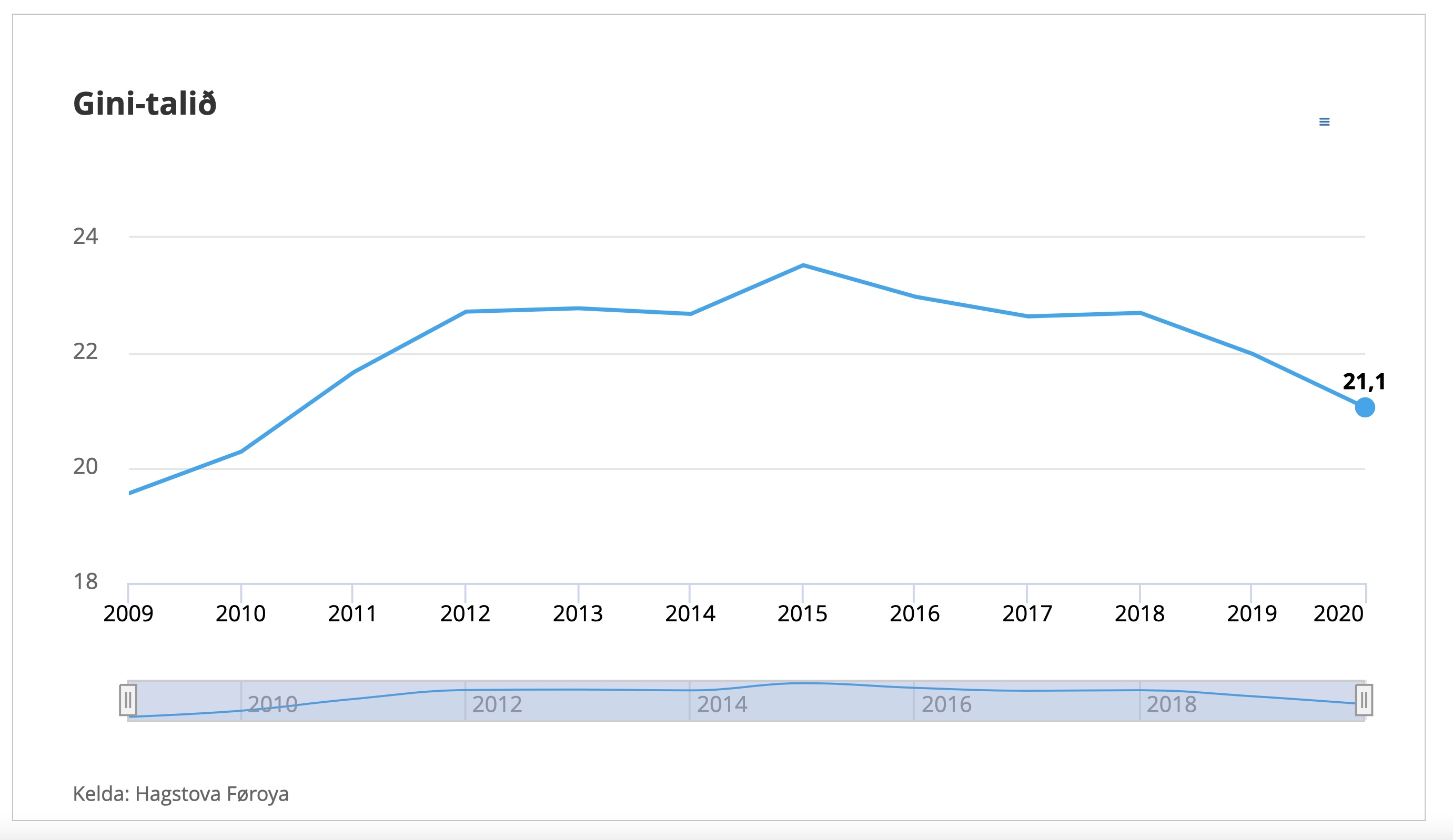 Uppgerðin hjá Hagstovuni vísir, at í 2019 var gini-talið í Føroyum 22, men í fjør var tað upp aftur lægri, ella 21,1. Verður hugt at Norðurlondunum, er inntøkubýtið ójavnast í Grønlandi, har gini-talið var 34,9 í 2020. Síðani kemur Áland har gini-talið var 27,9 í 2019. Í Danmark var gini-talið 27,3 2020 og og Svøríki var tað 26,9. Í Íslandi og er inntøkubýtið nakað javnari enn í hinum Norðurlondunum – uttan altso í Føroyum. Í Íslandi var gini-talið 23,2 í 2018. Annars sigurr Hagstovan, at í ES sum heild var gini-talið 30 í 2020.