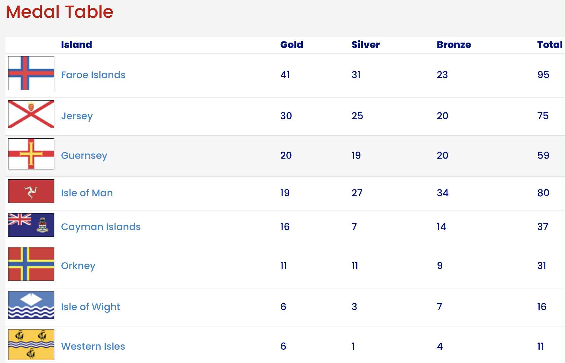 Hesaferð hava Føroyar vunnið oyggjaleikirnar við heili 95 heiðursmerkjum. Føroyar hava vunnið 41 gullheiðursmerki, 31 silvurheiðursmerki og 23 bronsuheiðursmerki.