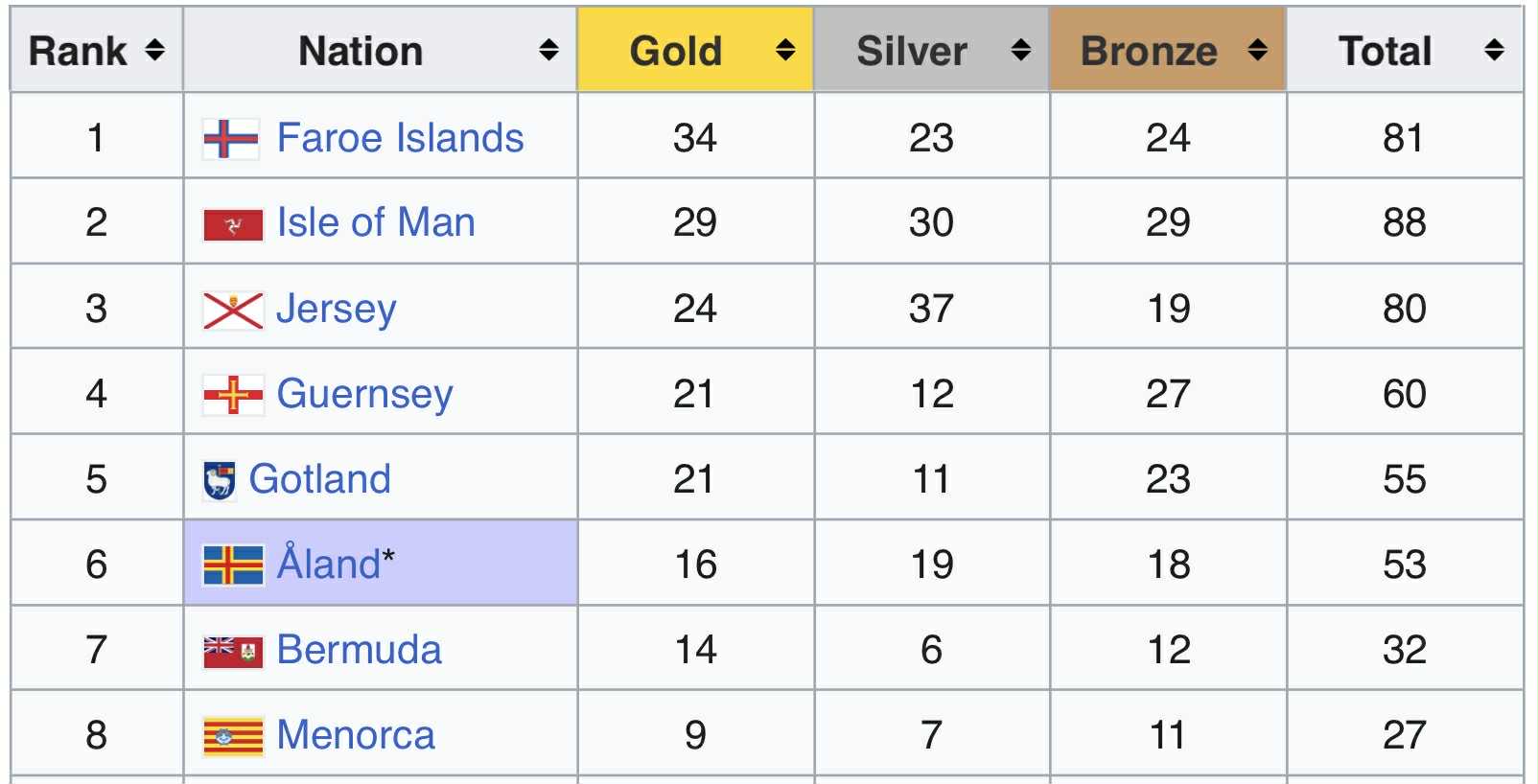 Føroyar hava 11 gullheiðursmerki fleiri enn Jersey, ið hevur 50.000 fleiri íbúgvar enn vit. Jersey vann samanlagt 74 heiðursmerki.