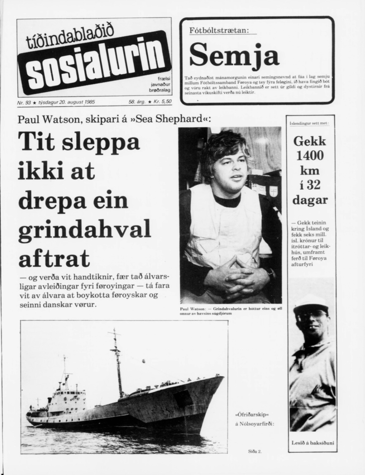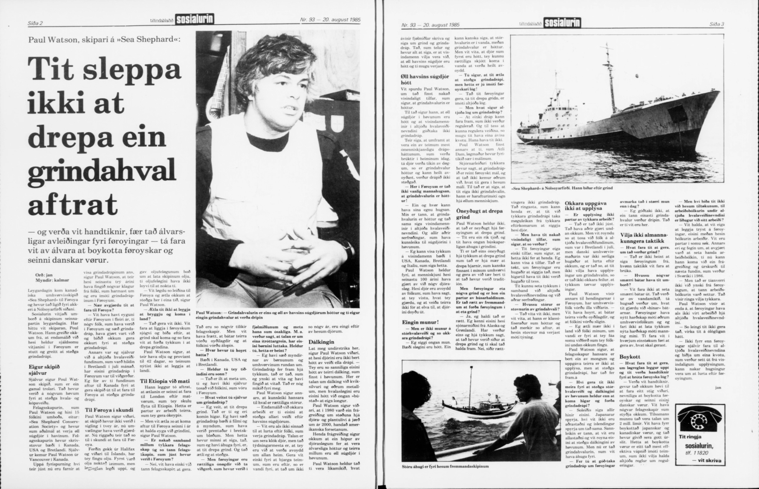 Lesið samrøðuna við Sea Shepherd í Sosialin 20. august í 1985: