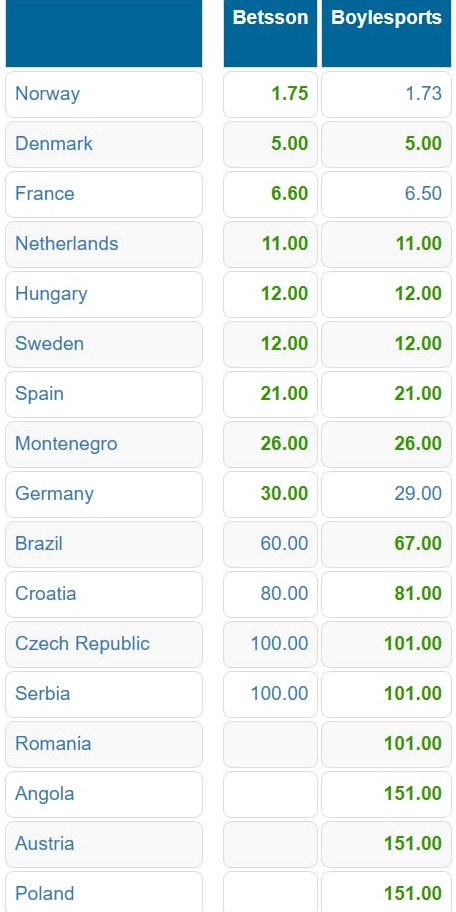 Noreg er sum ikki einaferð størsti favoritturin. Oddsini upp á, at Noreg vinnur HM eru so lág sum 1,73 og 1,75. Danmark er næststørsti favoritturin og Frakland er triðstørsti favoritturin.