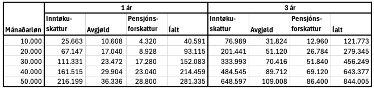 Talvan vísir, hvat løntakarar við ymiskari mánaðarløn rinda í inntøkuskatti, avgjøldum og pensjónsforskatti árliga og íalt í 3 ár.