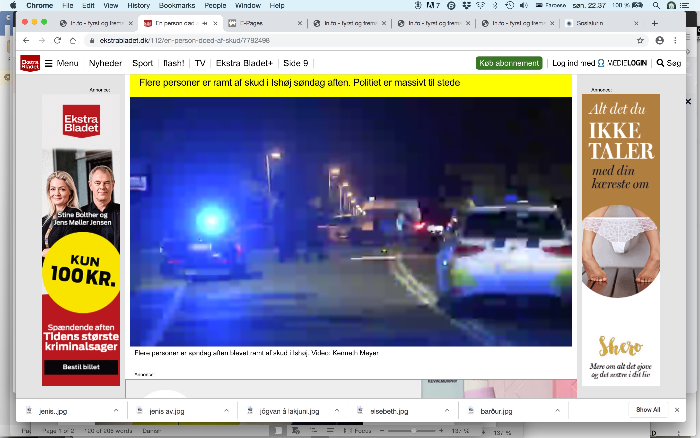 Á staðnum eru tveir oyðiligadir bilar á einum vegamóti. Annar hevur hol í forrútinum og í hurðini við førarasetrið, og har liggja nógv patrónshylstur á vegnum, skrivar Ekstar Bladet.