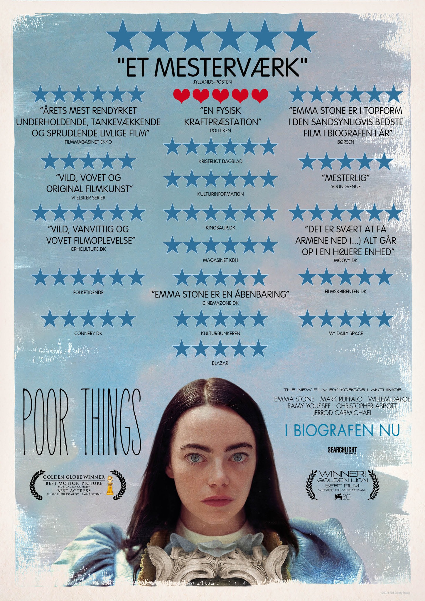 Poor Things byggir á samnevndu skaldsøguna hjá skotska Alistair Grey frá 1992, og kann lýsast sum ein romantisk Frankenstein-søga, har Golden Globe og Oscarvirðislønta Emma Stone fær høvuðsleiklutin sum hin unga Bella, ið granskarin Godwin (Willem Dafoe) vekir aftur til lívs.