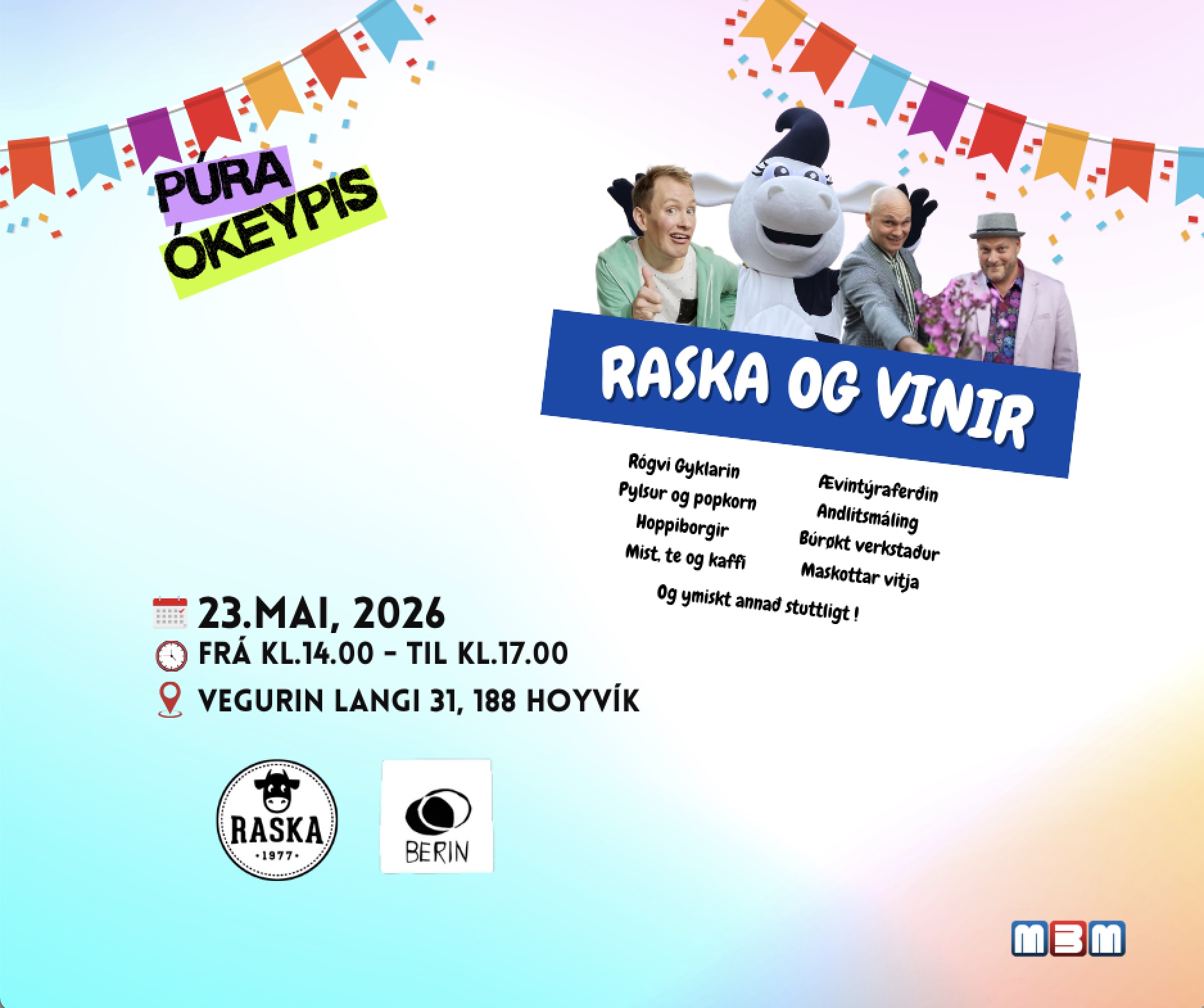 Á økinum hjá MBM verður bjóðað pylsir við tilhoyr, poppkorn, Mist, bollar og kakao og mangt annað. Eisini kunnu børnini njóta fleiri hoppiborgir, fáa andlitsmáling, síggja mjólkarbilin við meira.