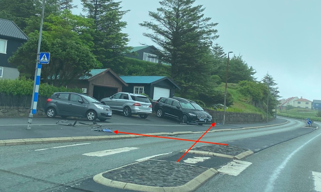 Løgreglan sigur, at hann rendi á oynna mitt á vegnum, har hann tók skeltið við sær, og so helt hann kósina fram upp á gongubreytina, har hann eisini rakti onkran bil, sum stóð parkeraður.