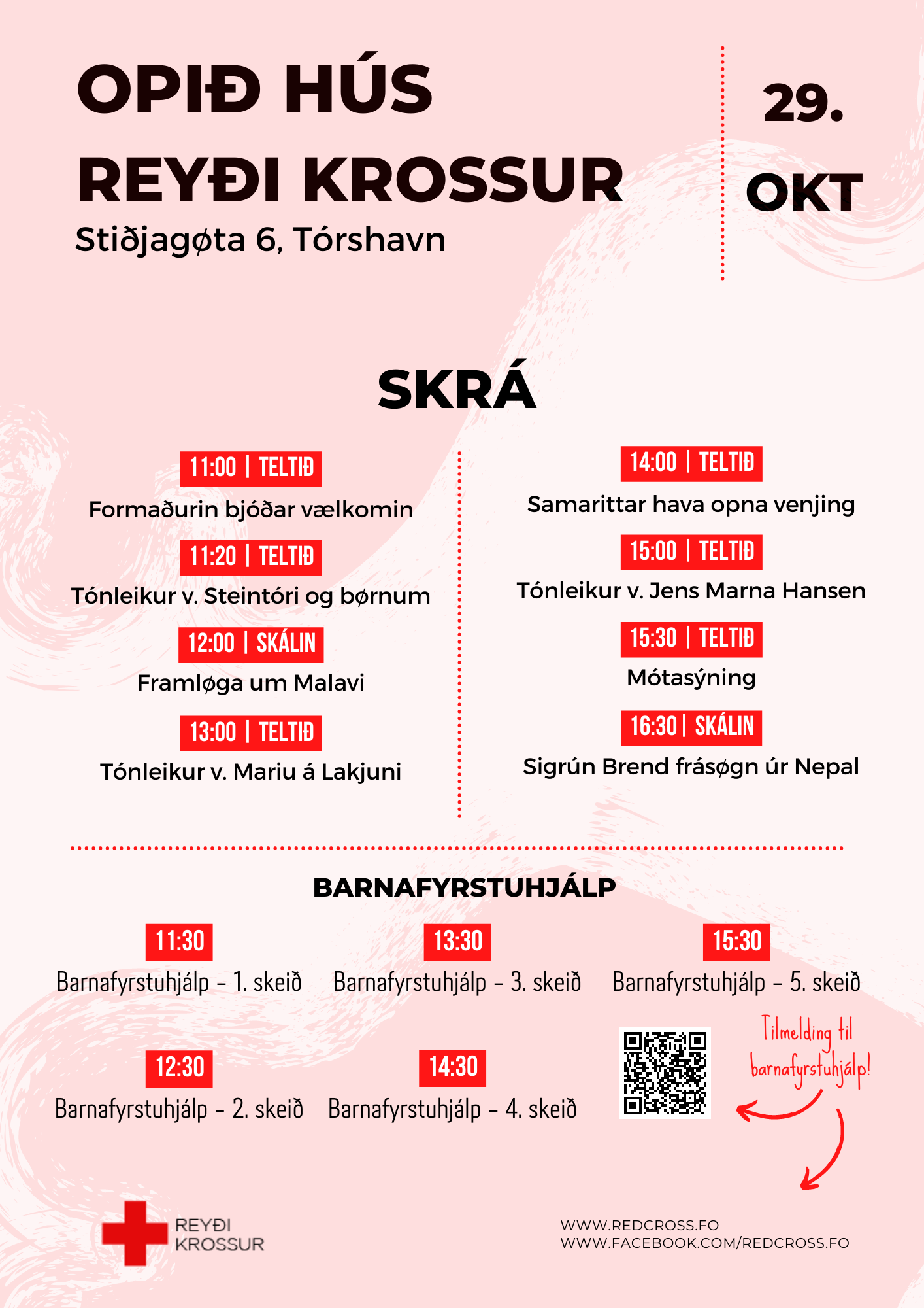29. oktobur kl. 11.00-17.00 verður nógv spennandi á skrá, tá Reyði Krossur hevur Opið Hús í Stiðjagøtu 6, Tórshavn.