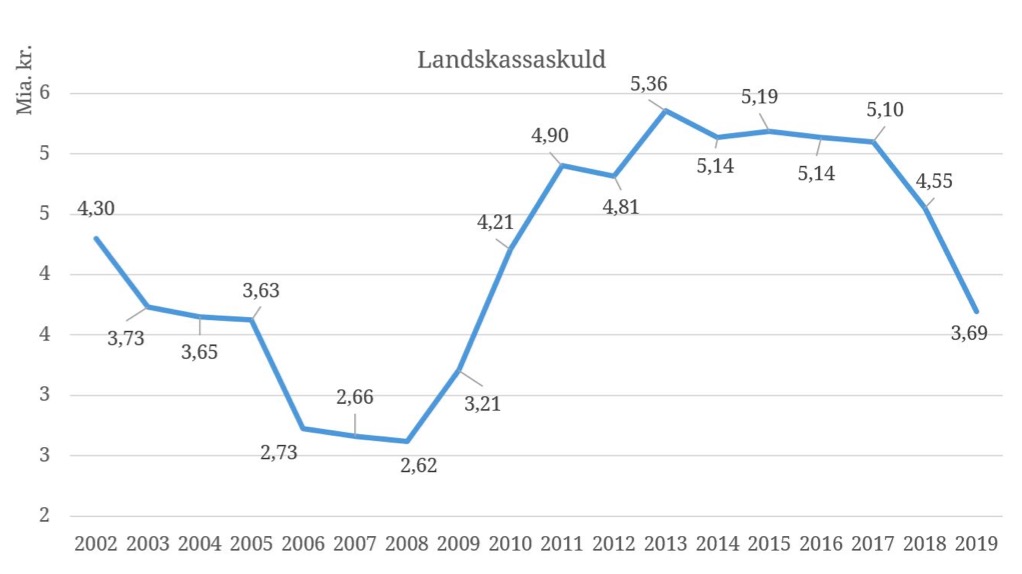 Í dag fer tann almenna skuldin hjá Føroyum at minka munandi. Í dag fer Landsstýrið nevniliga at rinda eitt lán upp á 1,1 milliard, men samstundis verður eitt nýtt lán upp á 300 milliónir tikið, so tilsamans fer almenna skuldin at minka 800 milliónir krónur í dag. Sostatt er almenna skuldin komin niður á 3,693 milliardir.