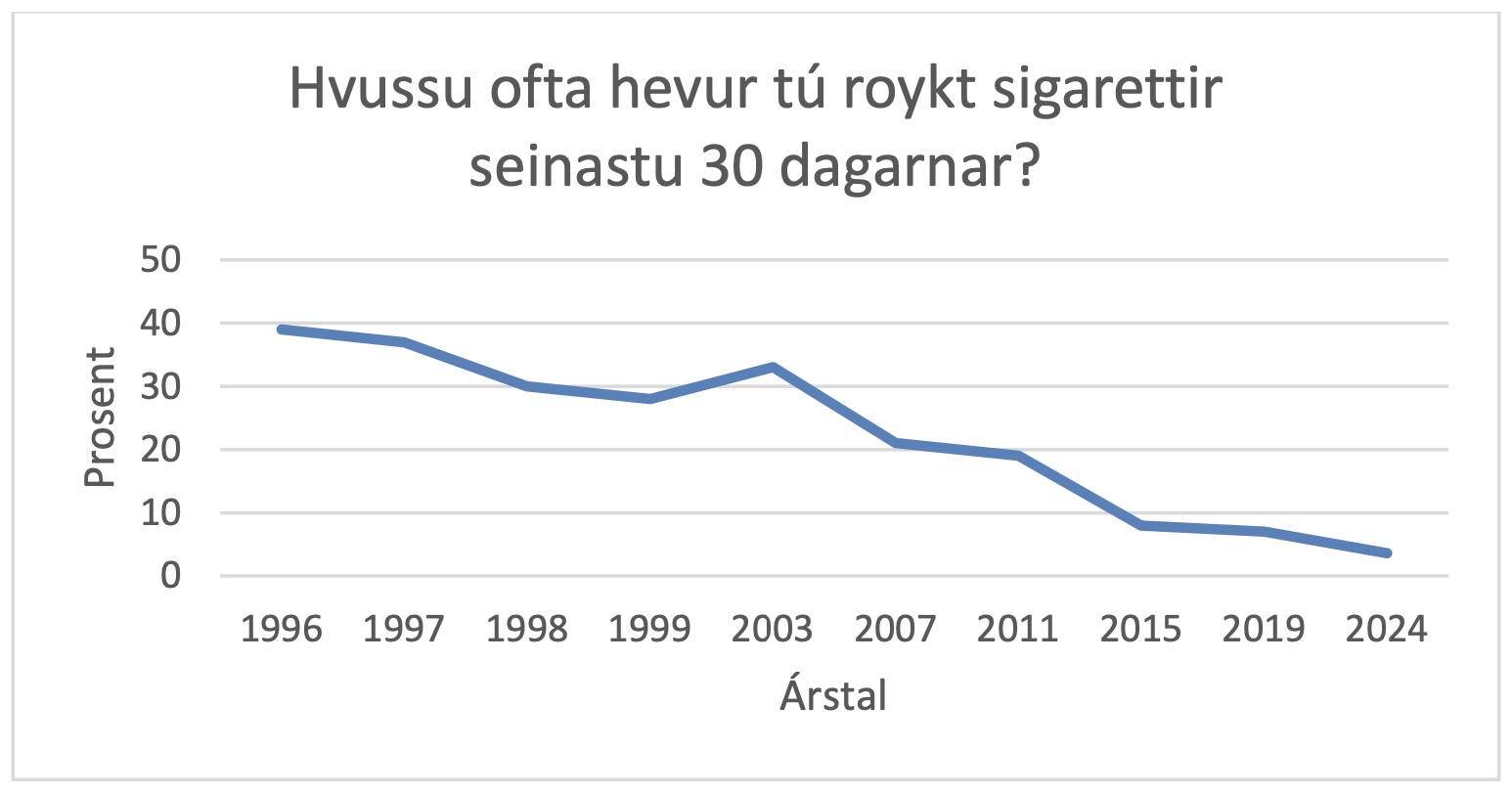 Góðu tíðindini eru, at sigarettroyking er minkað stórliga millum tey ungu hesi seinastu 30 árini. Í 1996 royktu meira enn ein triðingur dagliga, samanborið við 3,6% í 2024. Mest sannlíkt eigur miðvísa arbeiðið úti í skúlunum sín part av æruni av stóru minkingini. Tíverri er líkt til at aðrar nikotinkeldur eru komnar í staðin fyri sigarettirnar, nevniliga snús og e-sigarettir.