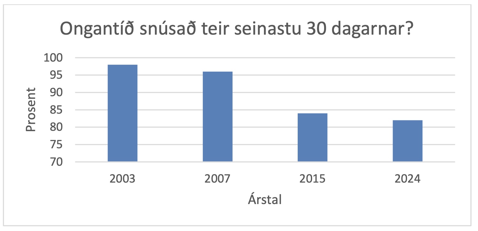 Um vit hyggja at ”Hvussu ofta hevur tú snúsað teir seinastu 30 dagarnar?” so sæst, at tað eru færri, sum ongantíð hava snúsað seinastu 30 dagarnar frá 98% í 2003 til 82% í 2024.