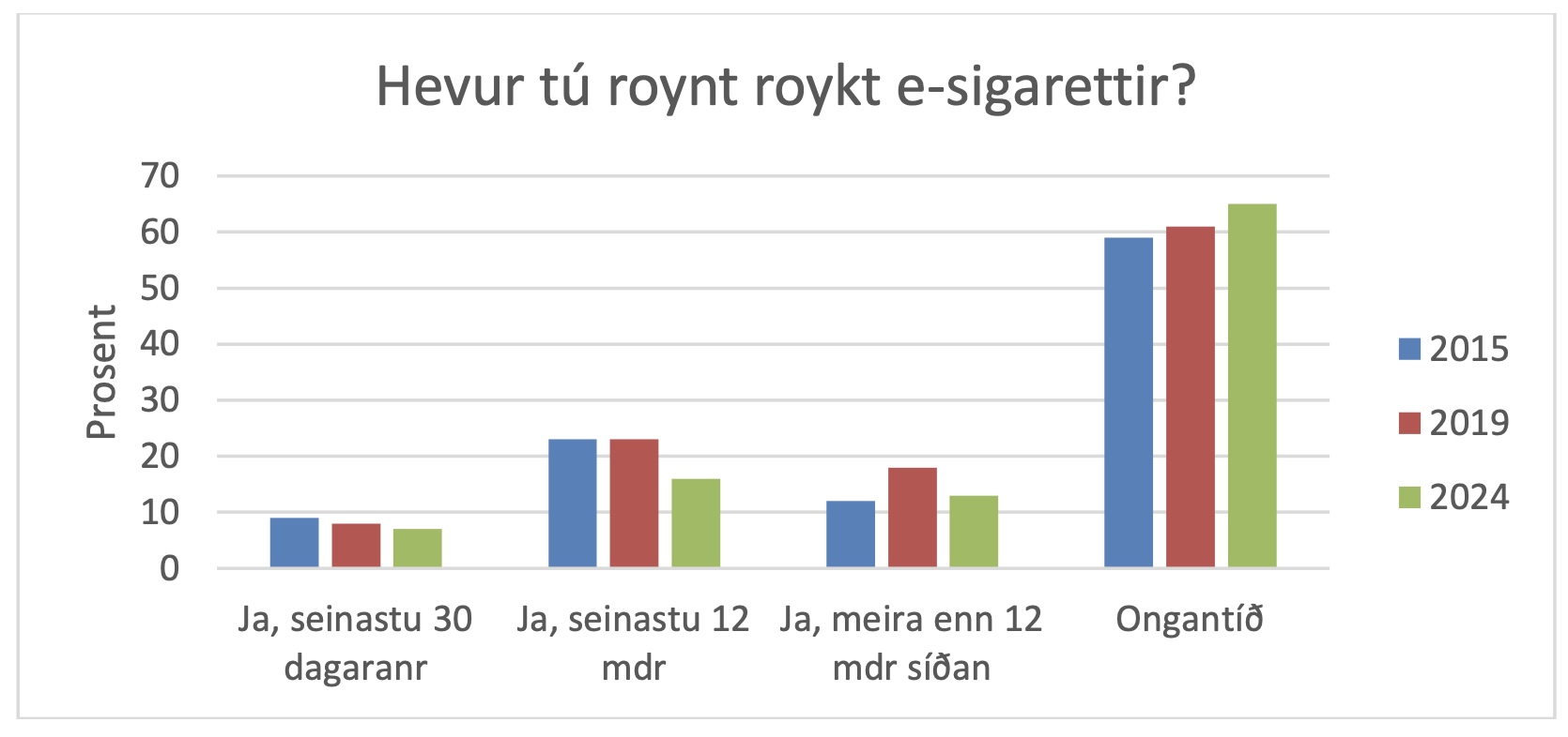Í 2015, 2019 og 2024 hava vit eisini spurt, um næmingarnir høvdu roynt e-sigarettir og teir svaraðu soleiðis: