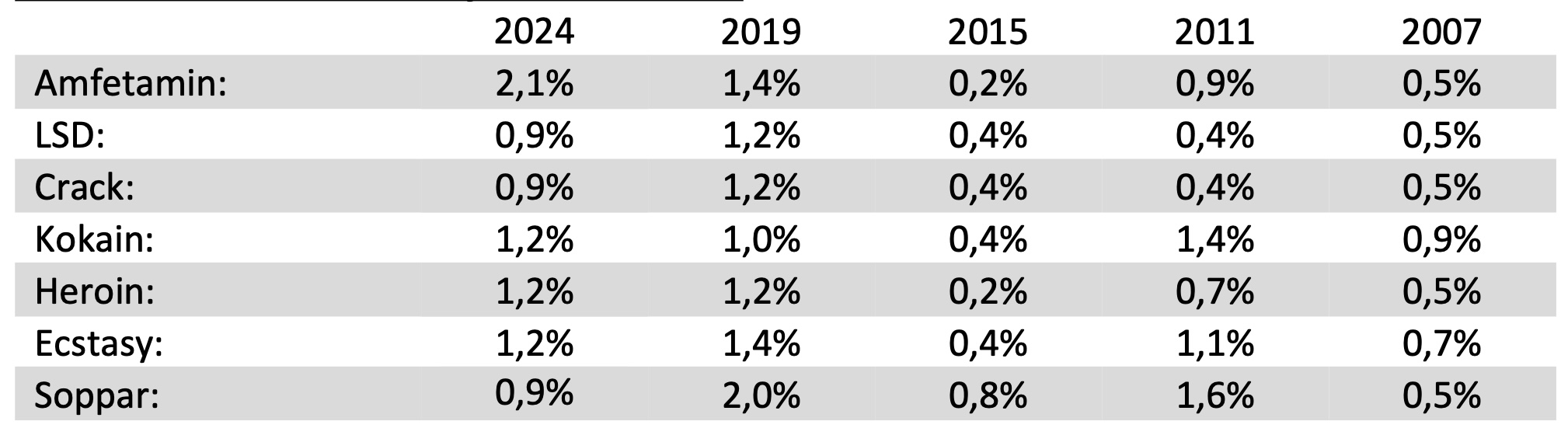 Seinastu 30 dagarnar søgdu 1,5% av næmingunum seg hava roynt hassj. Hetta tal var í 2019 3,5%.