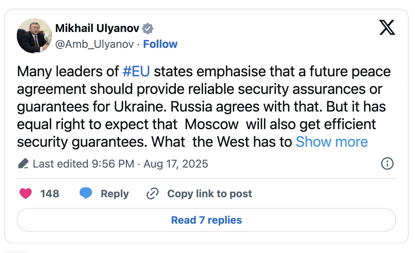 - Nógvir leiðarar í ES-londunum leggja dent á, at ein framtíðar friðaravtala skal geva Ukraina trúverdigar trygdarváttanir. Hesum tekur Russland undir við. Men tað (Russland, red.) hevur eins stóran rætt til at vænta, at Russland eisini fær veruligar trygdarváttanir, skrivar hann.