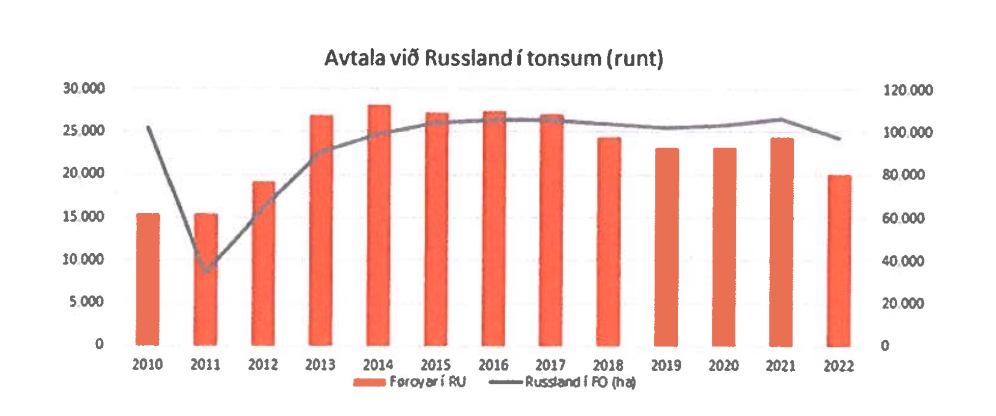 Myndin vísir, at síðani 2012 hava avtalaðu kvotanøgdirnar verið rættuliga støðugar í tonsum. Í 2011 var serliga støða, tí føroyska svartkjaftakvotan tað árið var bara 10.000 tons, og meginparturin av kvotuni varð latin Russlandi í kvotuumbýti.