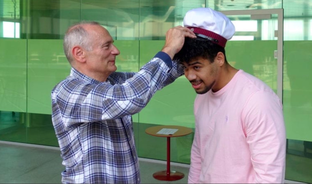 Sum hin fyrsti í søguni gjørdist Rune Olsen í dag studentur á Glasi. Rune, sum fær studentsprógv á náttúrubreytini, var til próvtøku í samfelagsfrøði og eftir tað fekk lærari hansara, Kristian á Neystabø, heiðurin at seta húgvuna á høvdið á honum.