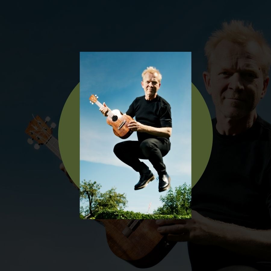 Á pallinum er Carsten Knudsen , og saman við honum er ukulele úr Hawaii, guitarar, didgeridoo, harmonium (pumpuorgil), munnharpa og onnur ljóðføri.