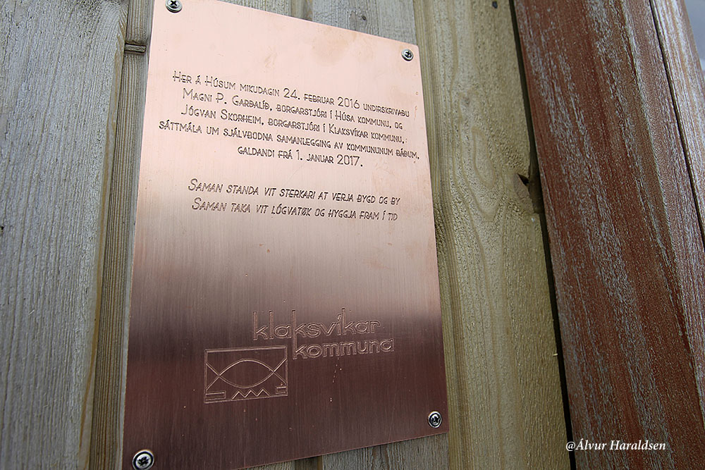 Aftaná at Magni P. Garðalíð, borgarstjóri í Húsa kommunu, og Jógvan Skorheim, borgarstjóri í Klaksvíkar kommunu, høvdu undirskrivað sáttmálan um samanlegging inni í skúlanum, fóru teir nevniliga útum, har ein minnispláta varð avdúkað á húsavegginum á skúlanum.