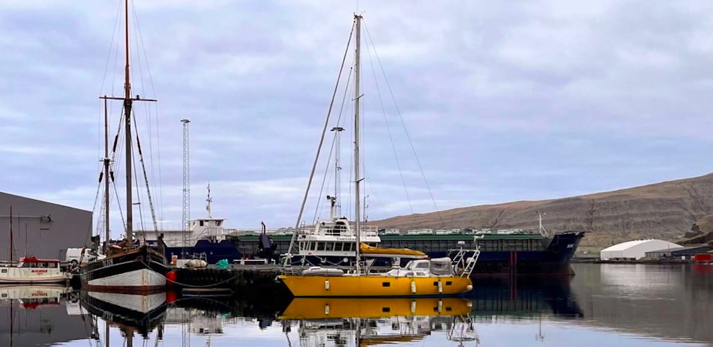 - Seglbáturin er komin úr Kirkwall í Orknoyggjum við seks fólkum umborð og fer víðari til Havnar eftir steðgin í Vági.