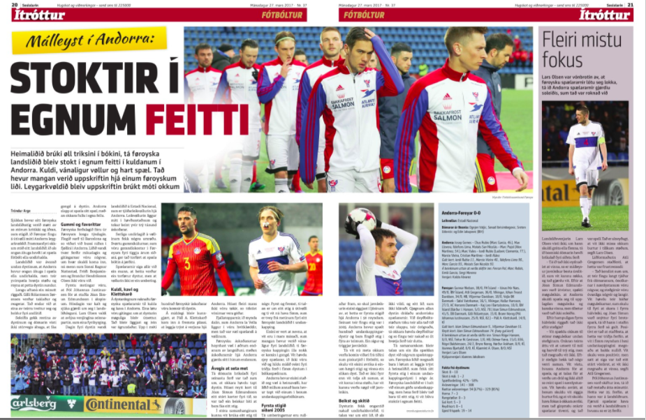 Tann 25. mars 2017 spældi føroyska landsliðið HM-undankappingardyst á útivølli Andorra. Árið frammanundan hevur Føroyar vunnið 2-0 á útivølli móti Lettlandi og spælt málleysan javnleik móti Ungarn á Tórsvølli.