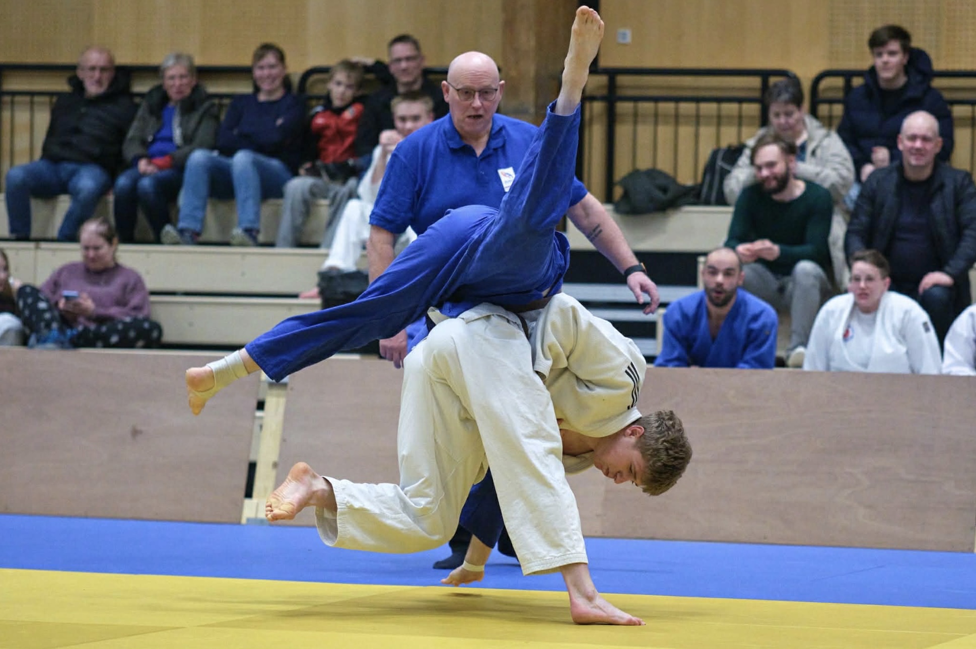 Í hvítum er Denis Golovkins úr Havnar Judofelag. Hetta er hansara seinasta ár sum unglingi. Hann hevur ment seg nógv, og má nú metast sum ein hin fremsti judoíðkarin í Føroyum. Um tvær vikur umboðar hann føroyska landsliðið til Europacup fyri mansunglingar í Berlin, sum er sterkasta kappingin av sínum slagi í Europa.