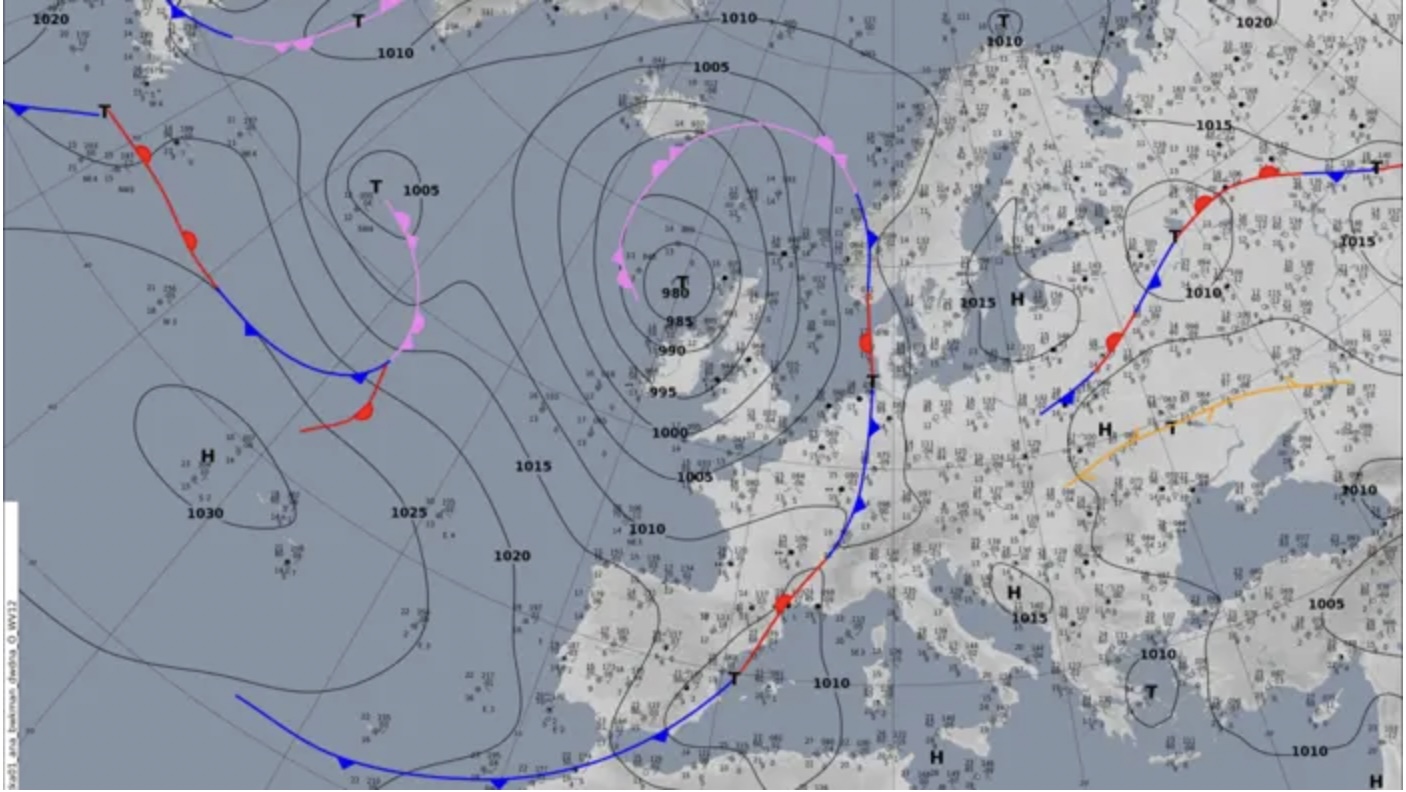 Sum sæst á permumyndini omanfyri, so lá eitt lágtrýst beint vestan fyri Skotland um mánaðarskiftið august/september og sendi slavna luft inn yvir Føroyar av landsynningi. Eitt samanrunnið brúgvalag var júst farið fram við Føroyum og ferðaðist síðani longur norðureftir, áðrenn tað hæsaði av.