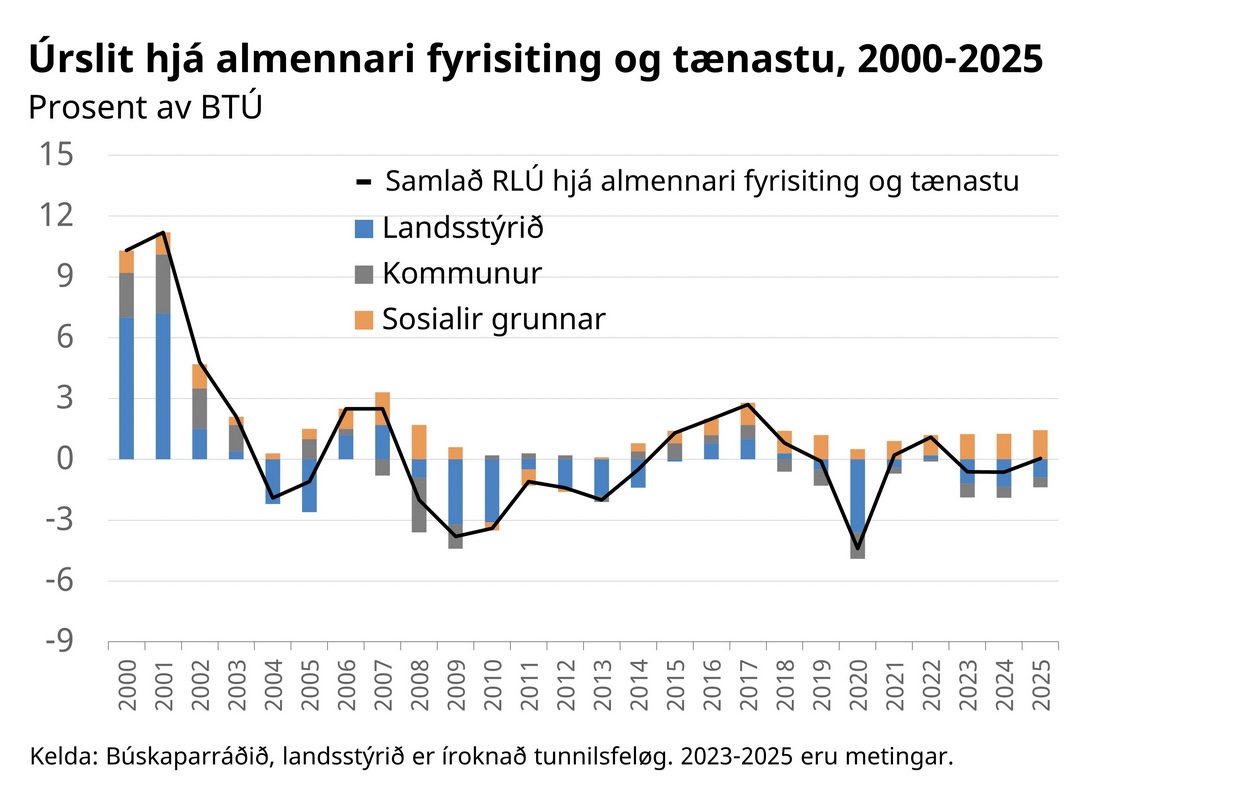 Hóast stóra framgongd í búskapinum seinastu 10 árini, eru yvirskotini í almennu fyrisitingini og tænastuni sera avmarkaði. Hetta skyldast bæði, at inntøkur landskassans eru minkaðar vegna skattalættar, og tí útreiðslurnar eru øktar.