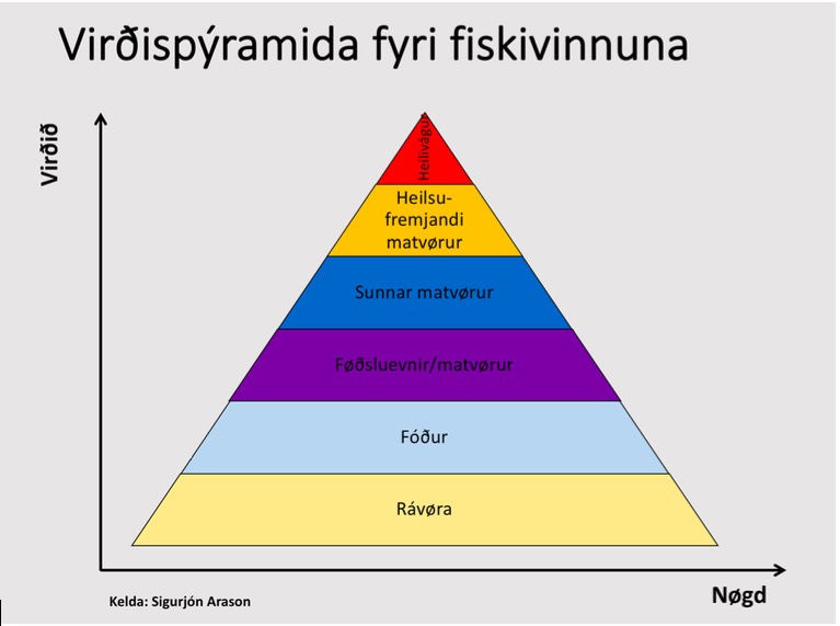 Skulu vit hava sum mest burturúr fiskivinnuni, og skulu vit veruliga bjóða okkara ungu vitanartung størv í fiskivinnuni, mugu vit framleiða lønsamar vørur, sum liggja ovast í virðispýramiduni, sum myndin vísir. Til hetta krevst vitan, íverksetarar og stórt virkisfýsni. Við nýggju sjófeingislógini er nærum eingin gularót hjá íverksetarum at finna nýggjar lønsamar vørur. Atgongd til rávørur er lykilin til at fáa íverksetarar. Hetta merkir eisini, at við sjófeingislógini, ið nú liggur í tinginum, veksur virkisfýsni alt ov lítið í mun til teir møguleikar, sum vit hava.