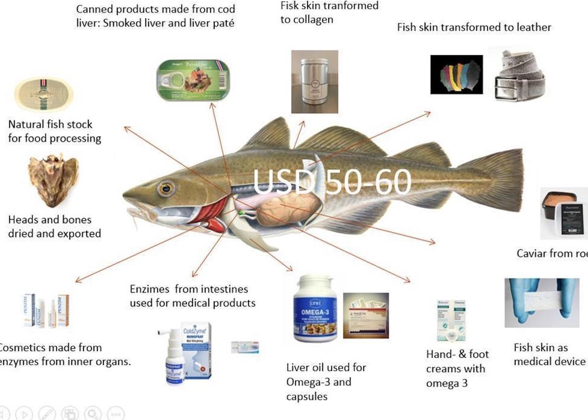 Í grannalondunum okkara hava tey í 10-15 ár framleitt hávirðisvørur burturúr hesum “burturkastinum”. Hetta hevur ført við sær munandi økingar í virðinum av fiskinum, ikki tí at meiri fæst fyri flaki ella runda fiskin, men tí nýggjar vørur eru skaptar burturúr restini av fiskinum, sum fyrr fór burtur, men sum nú gevur stórt avkast.