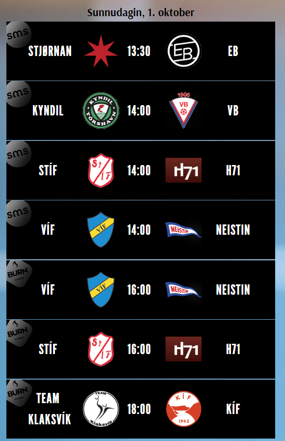 Fýra dystir vera leiktir í SMS-deildini og tríggir dystir vera leiktir í Burn mansdeildini.