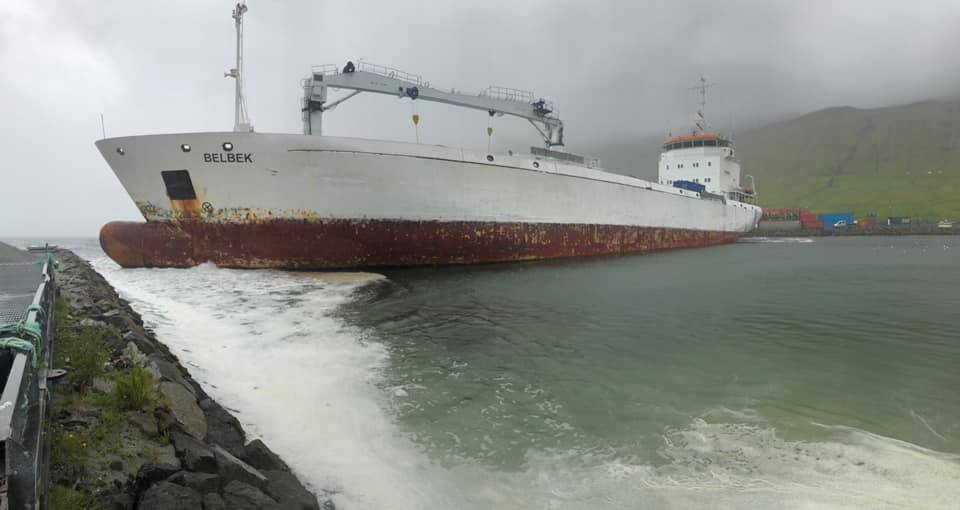 Farmasskipið Belbek situr í løtuni fast á Signabø.